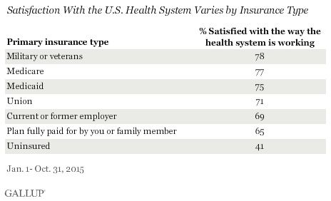 Overall, 67% of Americans are satisfied with the US health system in 2015, which is up slightly from 66% in November 2014. Gallup only started tracking satisfaction after the end of the first open enrollment period under the Affordable Care Act.