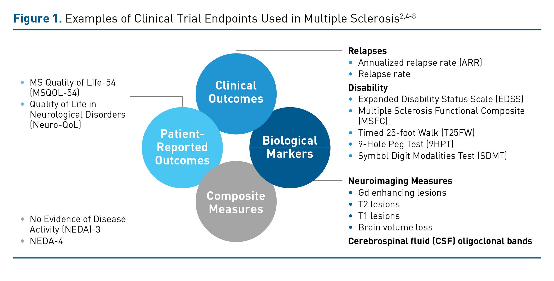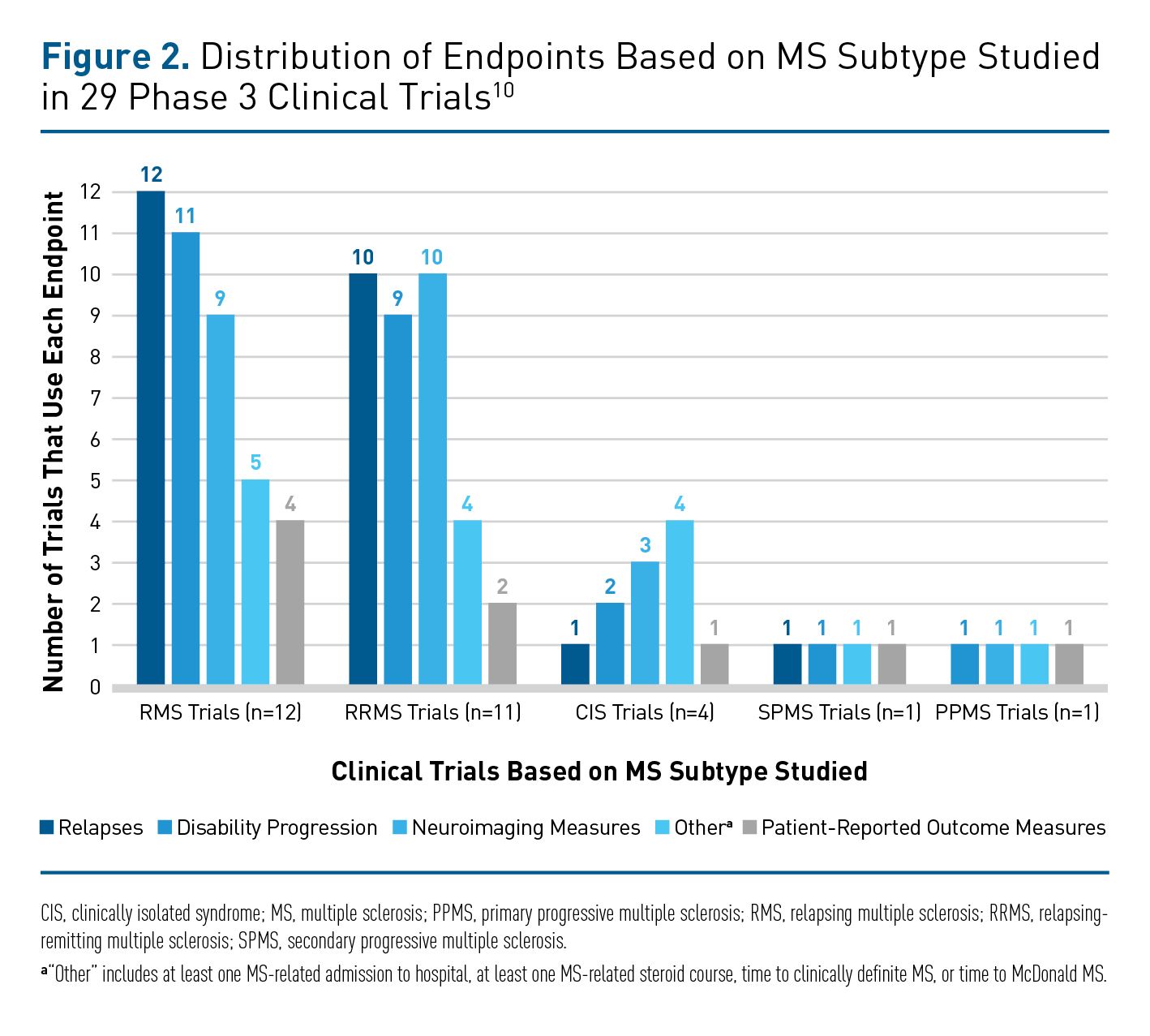 Due to the vastly different clinical presentations of relapsing and progressive forms of MS, DMTs that target these differences must be assessed using different endpoints. For example, relapses do not occur frequently in progressive forms of MS and, therefore, this subtype requires alternative endpoints.2 Figure 2 summarizes the endpoints used in 29 pivotal phase 3 trials among the various MS subtypes, including RRMS, relapsing MS (RMS), SPMS, PPMS, and clinically isolated syndrome (CIS).10