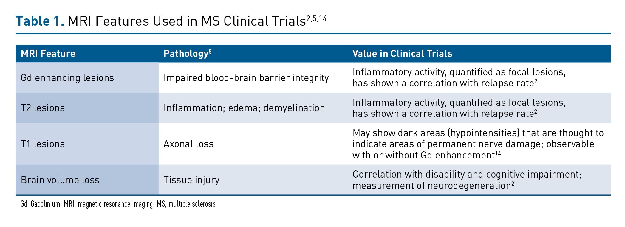 MRI lesions are objective, quantifiable, and highly sensitive in detecting subclinical disease activity.2 Examples of methods to measure MRI lesions are described in Table 12,5,14, which include Gadolinium (Gd) enhancing lesions, T2 lesions, and T1 lesions.