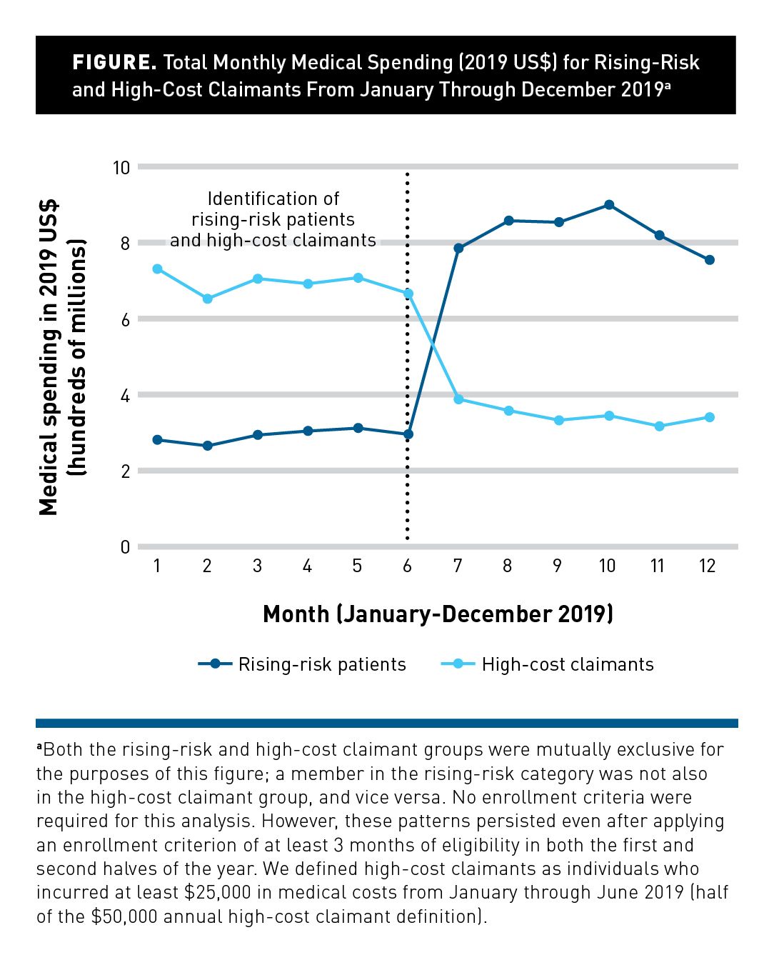The Figure illustrates the stark contrast in spending trajectories across these groups. From January through June 2019, the 1.78-million rising-risk patients accounted for $494.8 million in spending per month, with this spending surging to $982.0 million per month in the latter half of the year—a 98.5% increase. In contrast, spending in 2019 for the 83,386 high-cost claimants dropped by 41.6%, from $394.9 million to $230.8 million monthly—illustrating regression toward the mean.