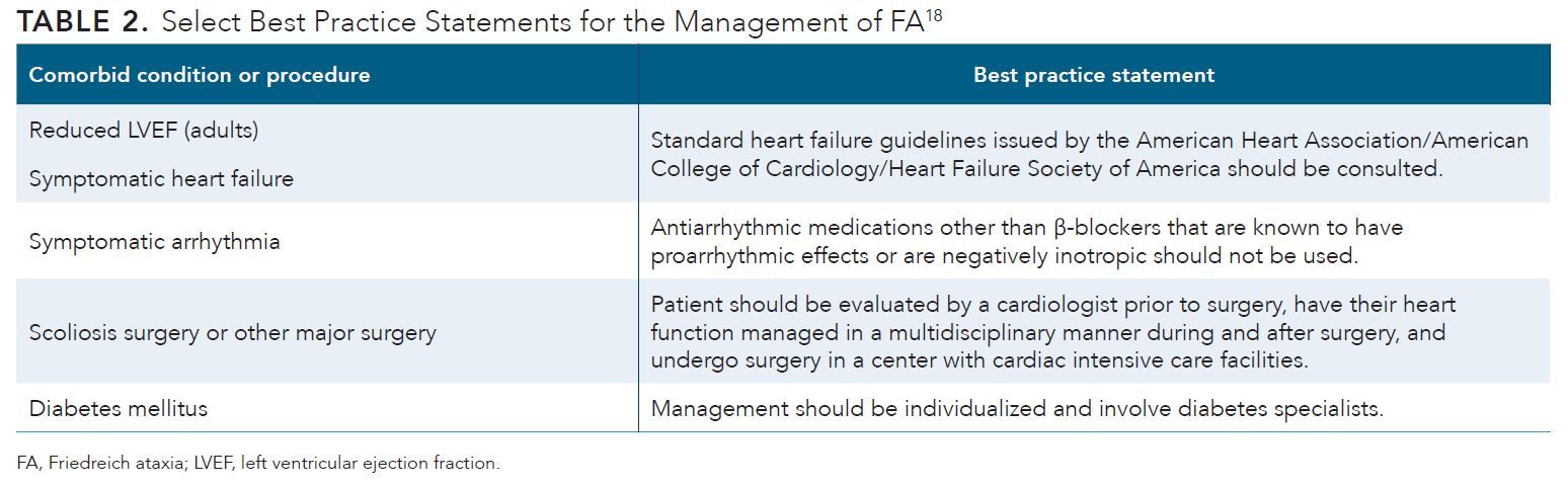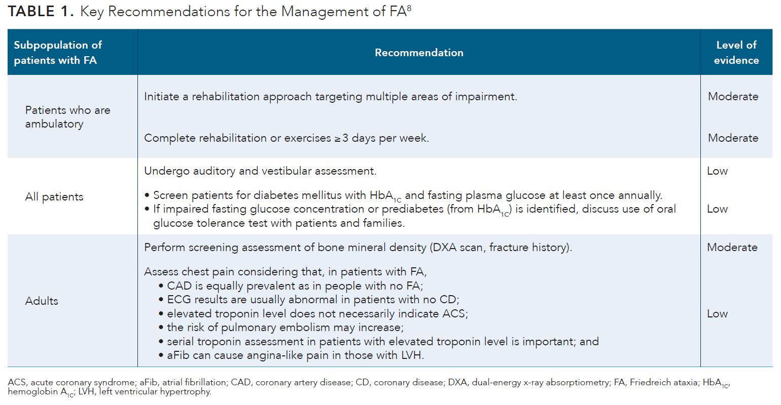 In November 2022, guidelines for the management of FA were published that were developed by 70 expert clinicians in collaboration with the FARA.8 These guidelines provide clinical management direction in 15 topic areas ranging from neurologic components of the disease to cardiovascular and mental health considerations for patients.8,18 Guideline authors emphasize the importance of early diagnosis, which may mitigate disease burden. Diagnosis often begins with patient complaints of neurologic symptoms and is confirmed with genetic testing.18