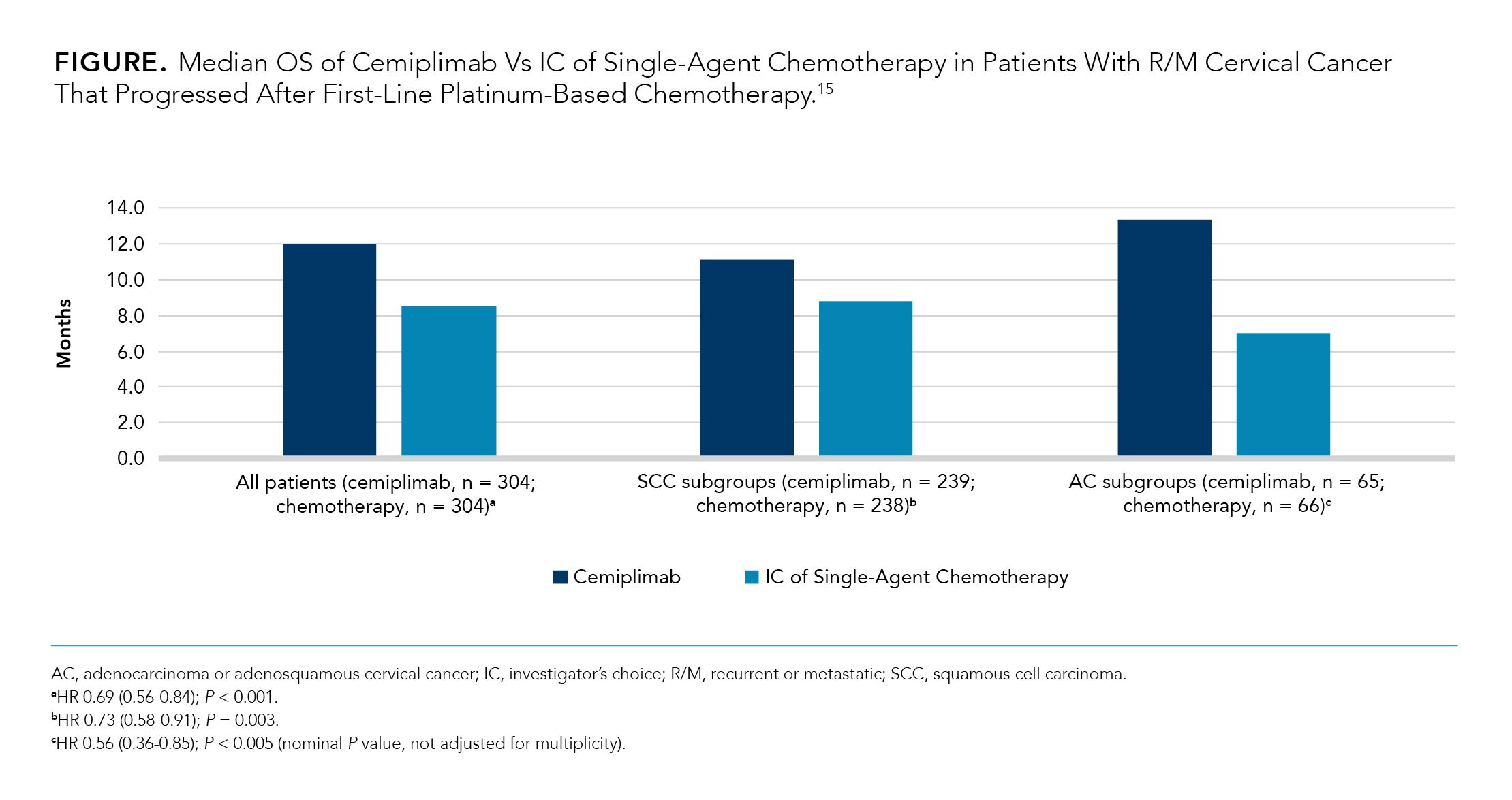 As shown in the Figure,15 the results of this study demonstrated that patients treated with cemiplimab (n = 304) experienced significantly longer median OS than patients treated with IC of single-agent chemotherapy (n = 304), regardless of PD-L1 status (12.0 months vs 8.5 months; HR 0.69, 0.56-0.84; P < 0.001). Among the patient subgroups, patients with ADC or adenosquamous cervical cancer experienced the longest median OS (13.3 months) when treated with cemiplimab (n = 65) but the shortest median OS (7.0 months) when treated with IC of single-agent chemotherapy (n = 66).15