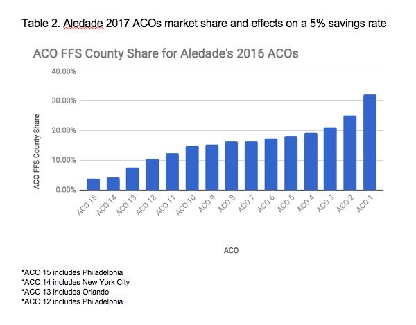 For some real-life perspective, Aledade operated 15 ACOs in 2017 with a range of 3.8% to 32.2% market share (Table 2).