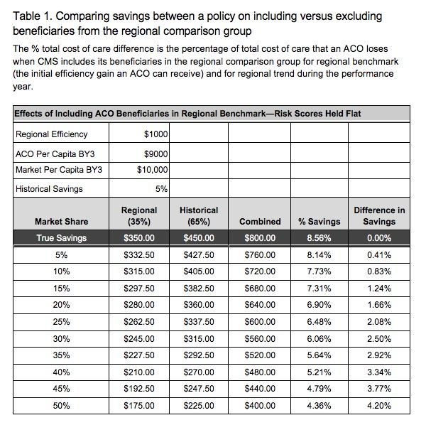 The year before an ACO starts its contract performance, CMS compares the risk-adjusted costs of ACO beneficiaries in a given year with the risk-adjusted costs of all assignable beneficiaries, including those in the ACO in the same region. By including the ACO’s beneficiaries, CMS decreases any regional efficiency of the ACO in direct proportion to its market share in the region.