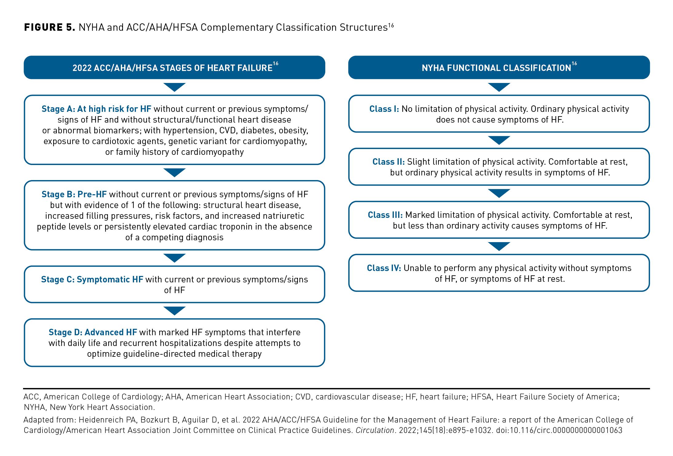 The New York Heart Association (NYHA) and the American College of Cardiology/American Heart Association/Heart Failure Society of America (ACC/AHA/HFSA) are the medical societies that developed systems for classifying and staging HF. The NYHA and the ACC/AHA/HFSA have created 2 systems that are complementary.16