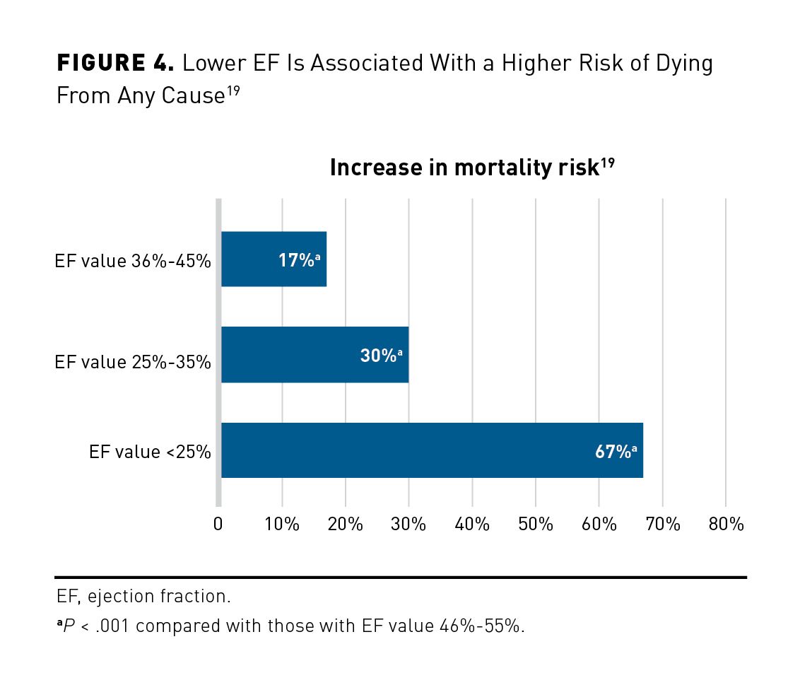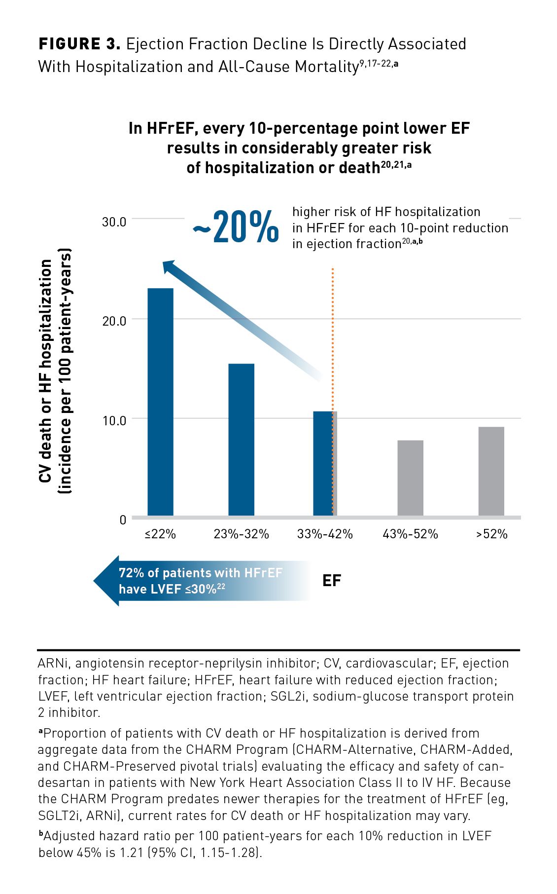 Ejection fraction (EF) has emerged as a unique predictor of CV outcomes. It is a measurement expressed as the percentage of blood the left ventricle (LV) pumps out with each contraction. Reduced EF is key to a patient’s disease progression, because a decrease in cardiac output triggers a pathologic chain of events that results in systolic HF. In fact, in patients with HF, declining LVEF is a meaningful and strong predictor of CV outcomes, including all-cause mortality, CV mortality, sudden death, HF-related death, fatal or nonfatal myocardial infarction (MI), and HF hospitalization.17