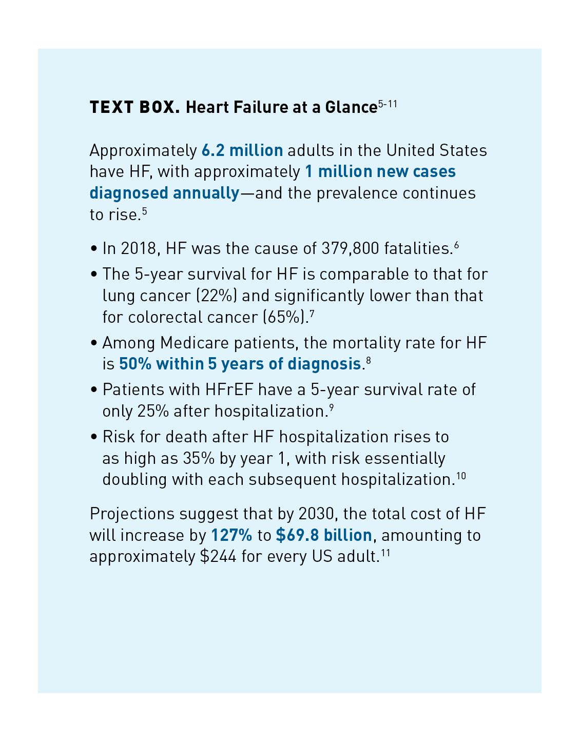 The incidence of HF has reached epidemic proportions; it is the most rapidly growing CVD health burden worldwide.2 Absolute numbers of patients with HF have been increasing due to the aging population, global population growth, and improved survival after diagnosis.3 With an estimated 64.3 million individuals living with HF globally, it is a clinical and public health crisis associated with significant mortality, morbidity, and health care expenditures, particularly among those 65 years and older (Text Box).3-11