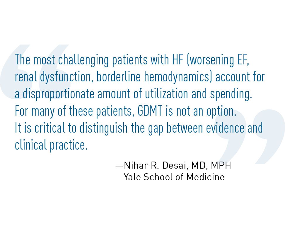 Emerging data suggest that WHF needs to be considered beyond hospitalization. It does not occur only in the hospital, as it is not based on location. Patients may experience WHF in the outpatient setting, and hospitalization or ED presentation may be avoided with adequately adjusted therapy.42 Select comorbidities can result in discontinuation of GDMT for hospitalized patients. For instance, worsening renal failure is common when managing chronic HF, and it may require discontinuation of ACE inhibitors/ARBs because of concerns about hyperkalemia.43 Chronic kidney disease plays an important role, as it affects up to 50% of patients with HF. The strongest predictors of adequate GDMT consist of absence of chronic renal disease or nonsustained ventricular tachycardia, low-income prescription benefits subsidy, and most recent EF evaluation occurring more than 1 month before placement of an implantable cardioverter-defibrillator.44
