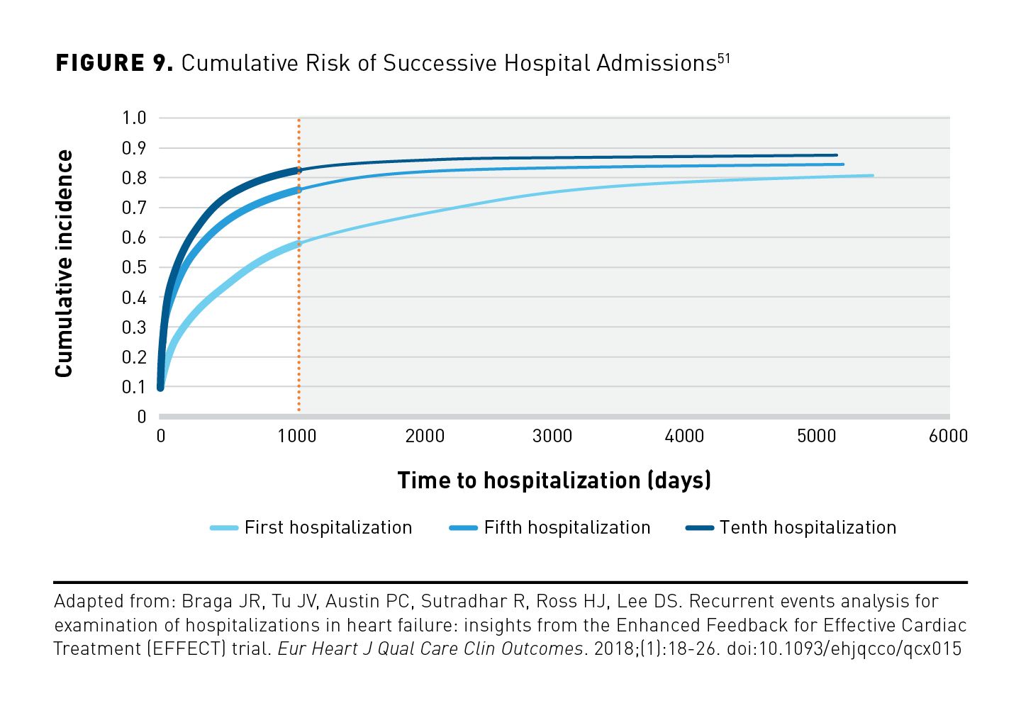A study of 8948 newly discharged patients with HF that sought to identify predictors of hospital readmission found progressive shortening of the interval between hospitalization episodes. The multivariable analysis consisted of a large cohort of patients with HF and found a sustained association between previous hospitalizations and the rate of subsequent hospitalizations.51