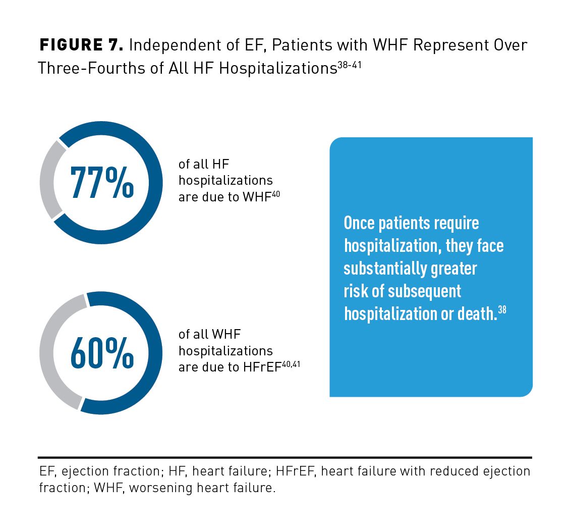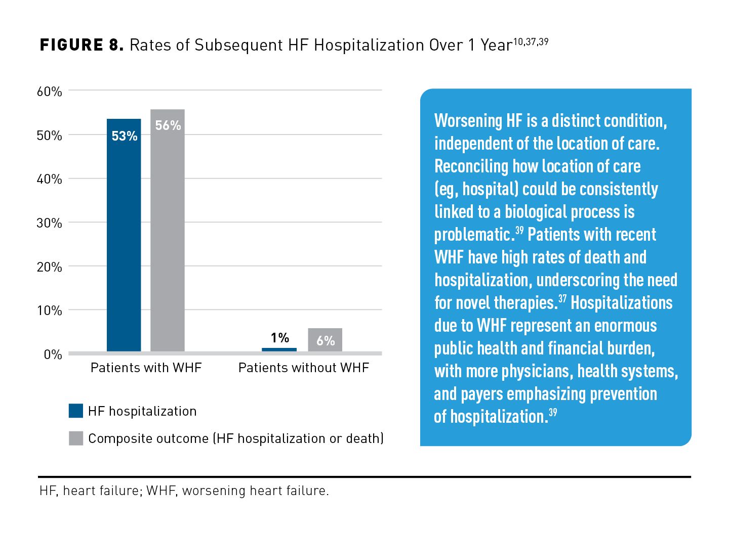 WHF is increasingly used as an accepted inclusion criterion, end point, or part of a combined end point in clinical trials.10 In general terms, WHF is worsening of chronic HF that occurs during hospitalization or in the ambulatory setting. It often results in adjustments to long-term therapy and inpatient hospitalization and is associated with an unfavorable prognosis (Figure 7).38-41