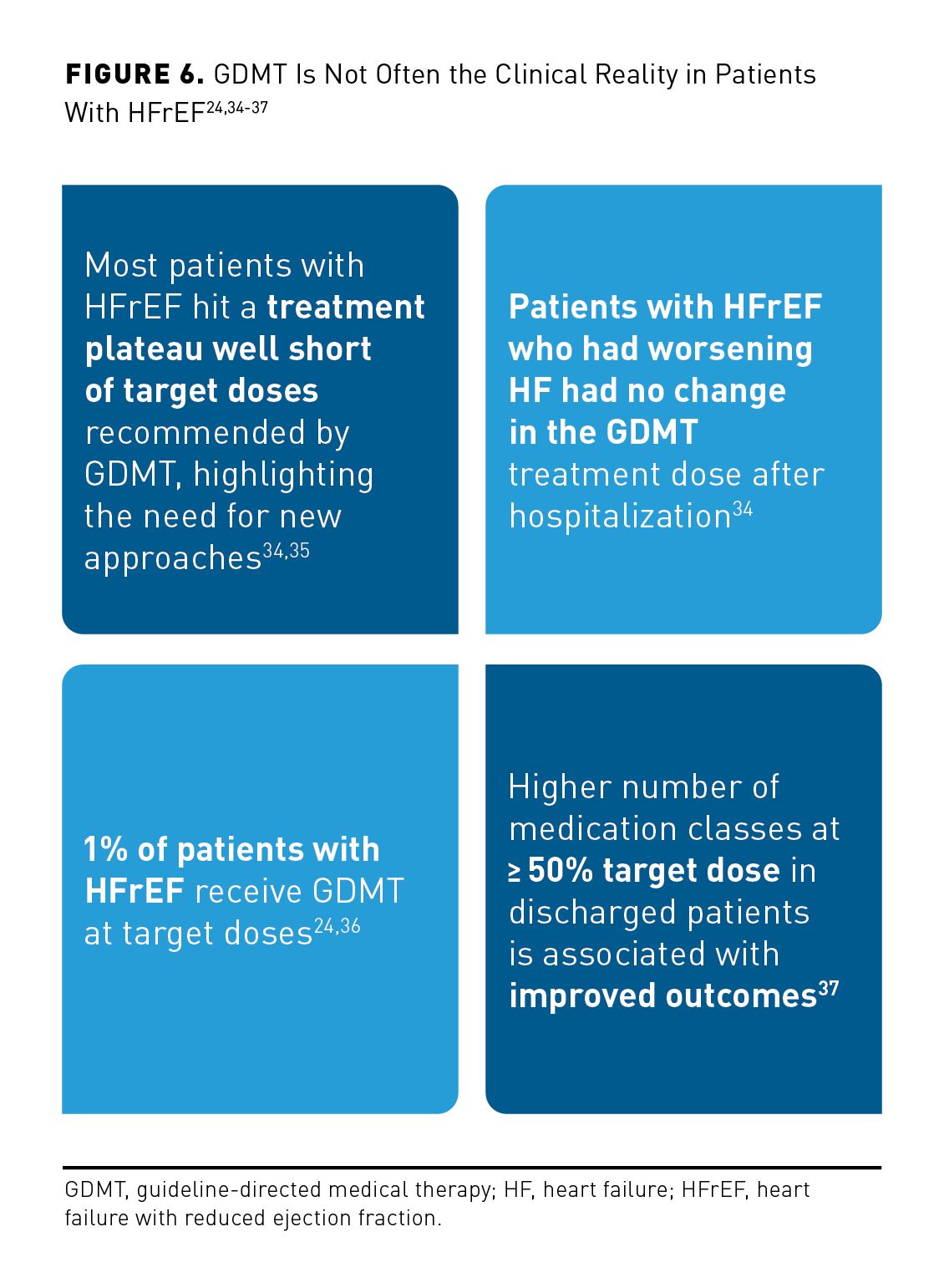 GDMT has the potential to be the mainstay of pharmacologic therapy for HFrEF.16 However, it presents inherent challenges, because patients with HF represent a heterogeneous cohort with multiple comorbidities. Among Medicare beneficiaries with chronic HF, 41% to 55% have 5 or more noncardiac comorbidities, which increases the risk of hospitalization in this patient population and all hospitalizations proportionately.32