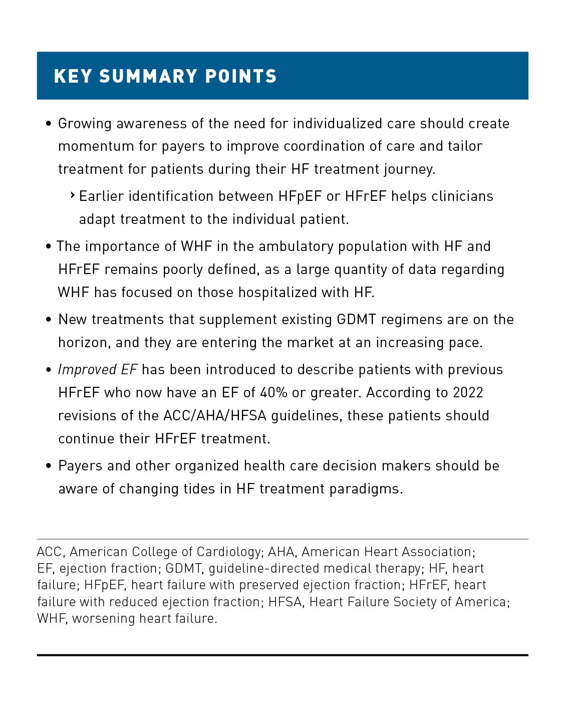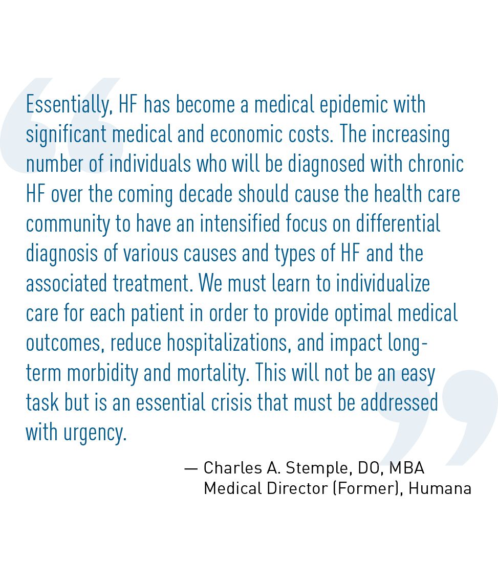 INTRODUCTION: Approaches to treating heart failure (HF), understanding of the most timely and effective interventions, and identification of appropriate patient subpopulations must evolve. HF has emerged as a chronic condition that needs to be managed on multiple fronts. Hospital resources are more limited than ever due to various factors that directly impact staff and hospital space available to manage and treat patients with HF. As a result, there is increasing attention to the current state of this progressive disease and ways to improve patient outcomes.
