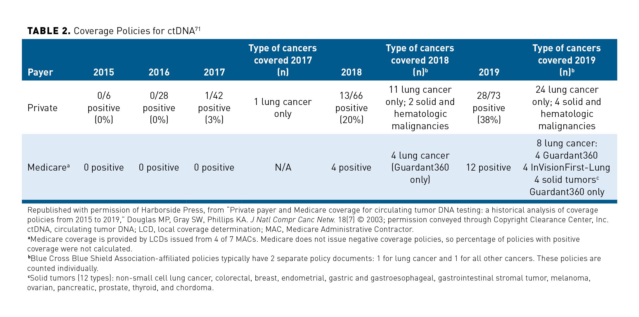 71. Douglas MP, Gray SW, Phillips KA. Private payer and Medicare coverage for circulating tumor DNA testing: a historical analysis of coverage policies from 2015 to 2019. J Natl Compr Canc Netw. 2020;18(7):866-872. doi: 10.6004/jnccn.2020.7542