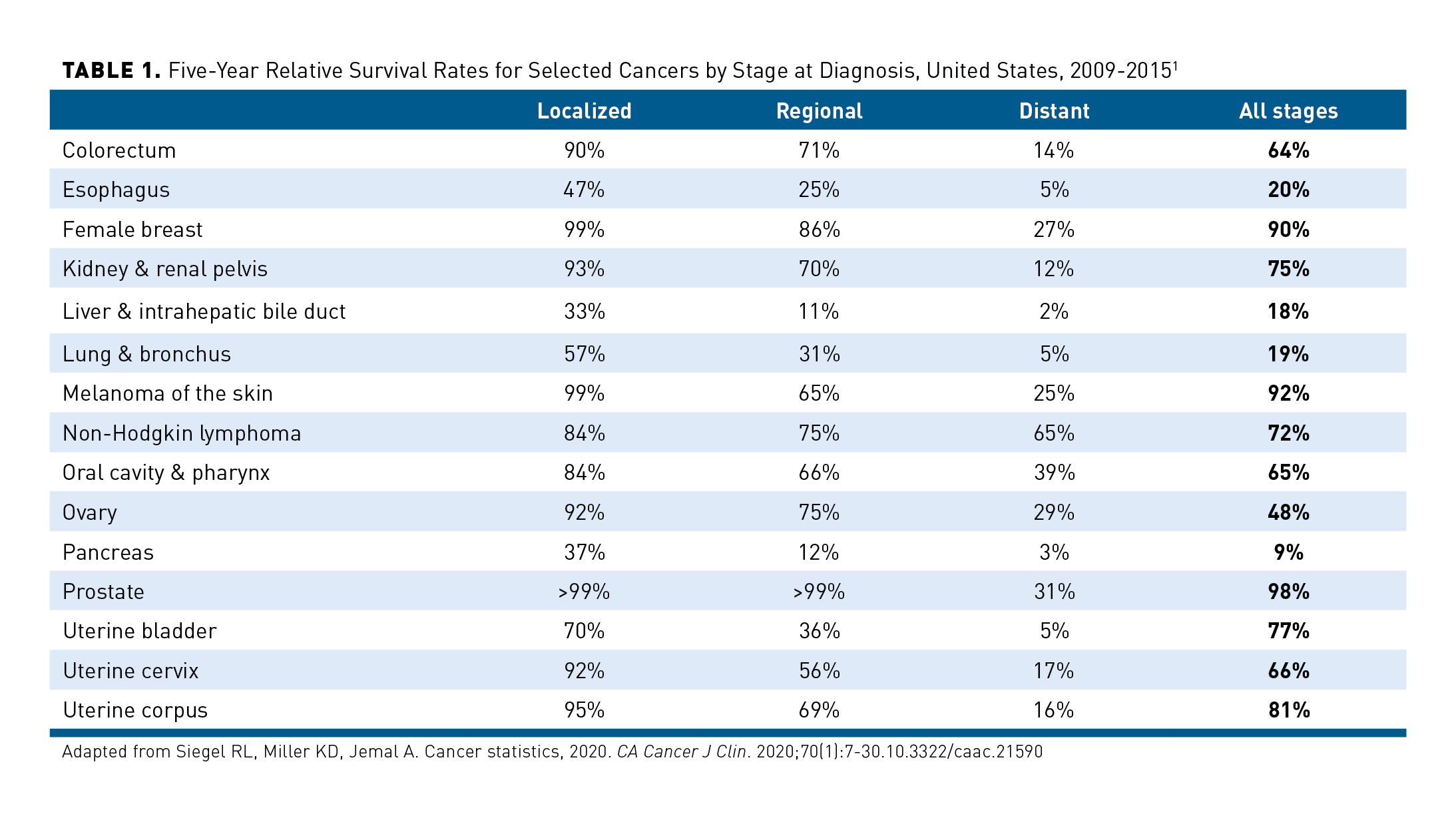 Clarke et al examined the potential reductions in cancer-related deaths if malignancies diagnosed after metastasis were, instead, diagnosed at earlier stages. Although stage IV cancers represented 18% of all diagnoses, they accounted for 48% of all cancer-related deaths within 5 years.9 The researchers found that if these patients had been diagnosed at stage III, there would have been 51 fewer cancer-related deaths per 100,000 (or 15% of all cancer-related deaths). If one-third of metastatic cancers were diagnosed at stage III, one-third at stage II, and one-third at stage I, there would be 81 fewer cancer-related deaths per 100,000 (or 24% fewer cancer-related deaths).9