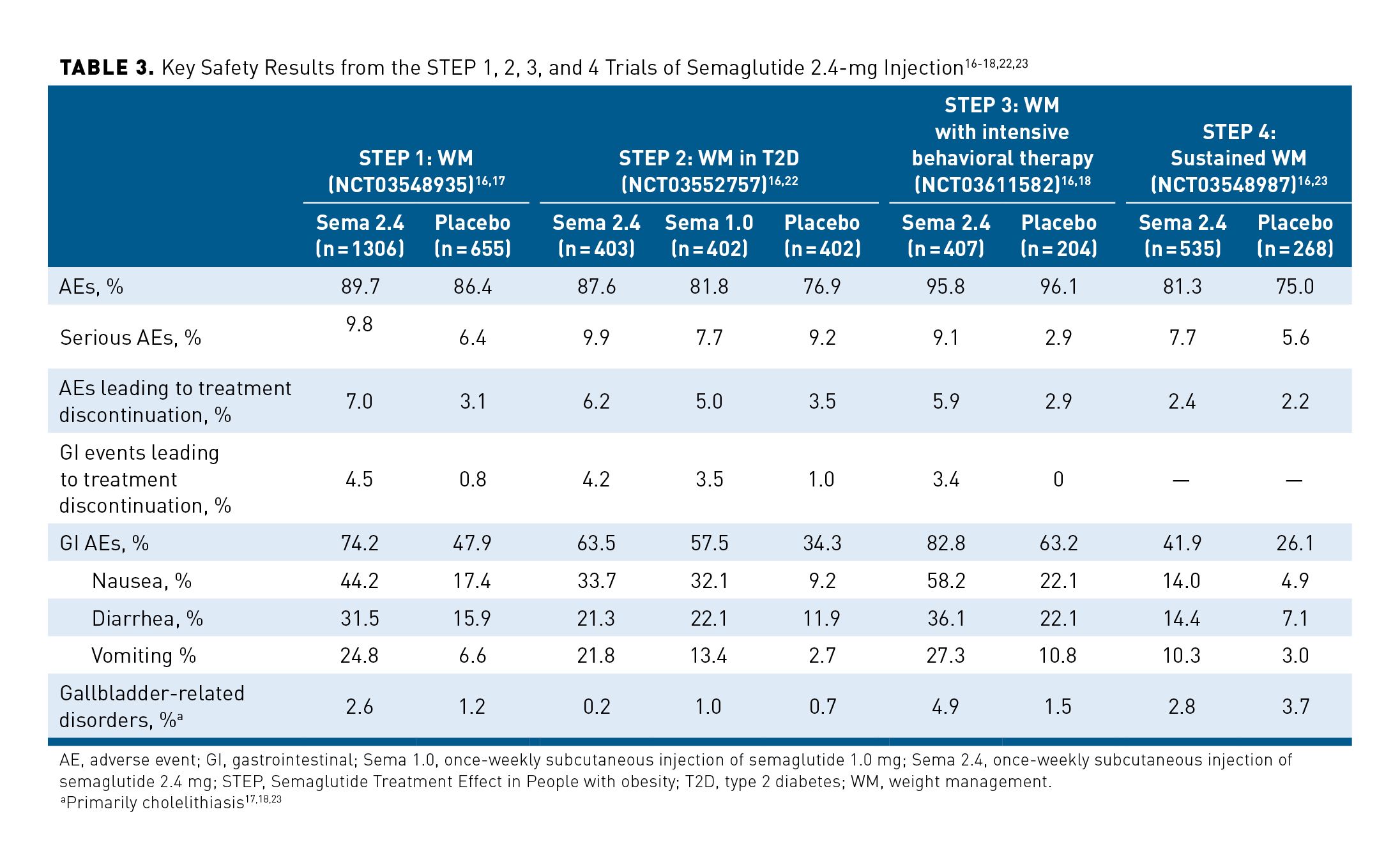 Safety results reported across STEPs 1 to 4 are shown in Table 3.16-18,22,23 Overall, the safety profile of semaglutide 2.4 mg was consistent with previous reports for use of GLP-1RAs in clinical trials and with known effects of rapid weight loss; no new safety concerns emerged in analyses of safety data from STEPs 1 to 4.17,18,22,23 Investigators used the Medical Dictionary for Regulatory Activities to identify additional safety areas of interest or focus based on regulatory feedback and requirements and the therapeutic experience previously reported with GLP-1RA treatments.17,18,22,23