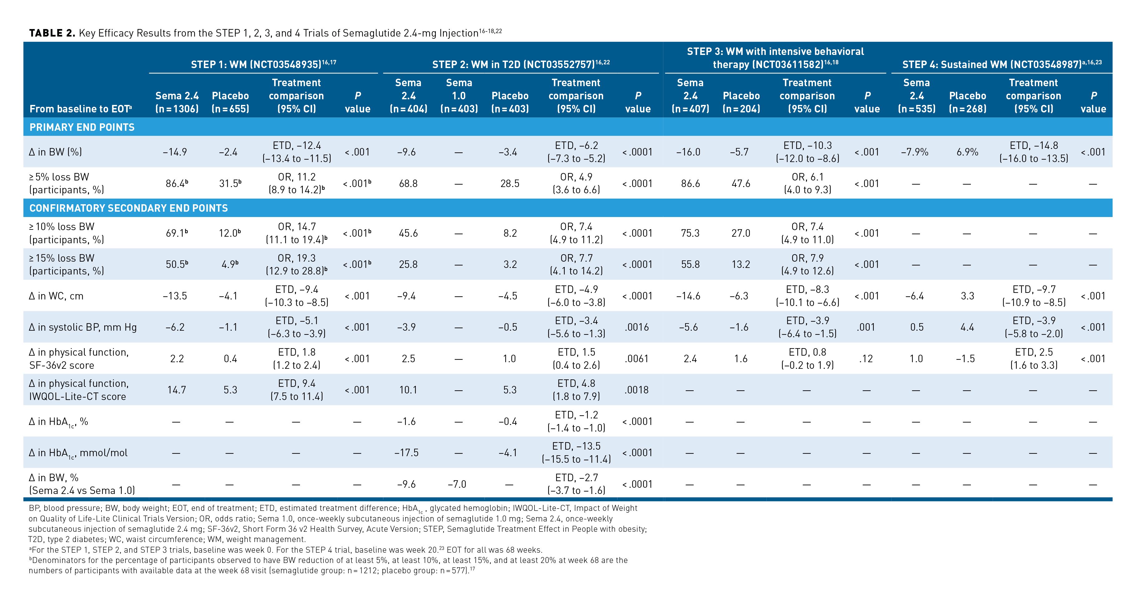 Results of STEPs 2 to 4 corroborated the efficacy and safety seen in STEP 1, across patients with T2D (STEP 2) and patients also receiving intensive behavioral therapy (STEP 3), and in comparison to patients who were withdrawn from semaglutide therapy at 20 weeks (STEP 4). Results of STEP 2 also demonstrated that patients treated with semaglutide 2.4 mg had significantly greater reductions in HbA1c levels than did patients given placebo and significantly greater weight loss than did patients given semaglutide 1.0 mg or placebo.22