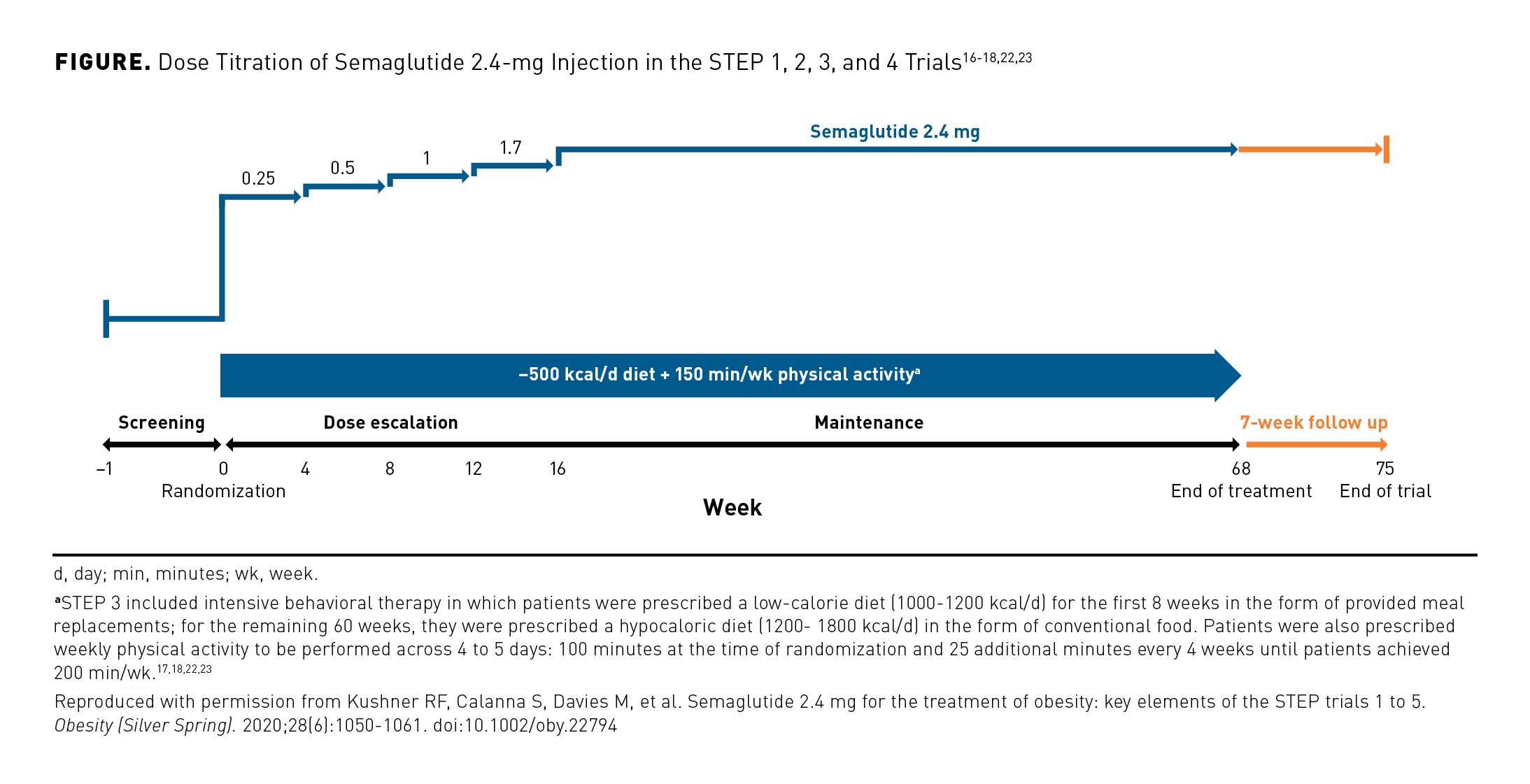 In STEPs 1 to 4, patients received lifestyle intervention in combination with either placebo, subcutaneous semaglutide 1.0 mg, or semaglutide 2.4 mg for 68 weeks. The trials included a 7-week follow-up period. In patients randomly assigned to receive semaglutide 2.4 mg, the medication was initiated at a dose of 0.25 mg. The dose was escalated every 4 weeks (0.5 mg, 1.0 mg, 1.7 mg, 2.4 mg) over a 16-week period; this was followed by a 52-week period at the maintenance dose of semaglutide 2.4 mg (Figure).16-18,22,23 STEPs 1 to 3 assessed outcomes across this 68-week treatment period. To determine the effects of semaglutide 2.4 mg on sustained weight management, patients in STEP 4 received semaglutide on a dose escalation schedule for 20 weeks and then were randomly assigned to either continue active treatment or switch to placebo for the duration of the study.16