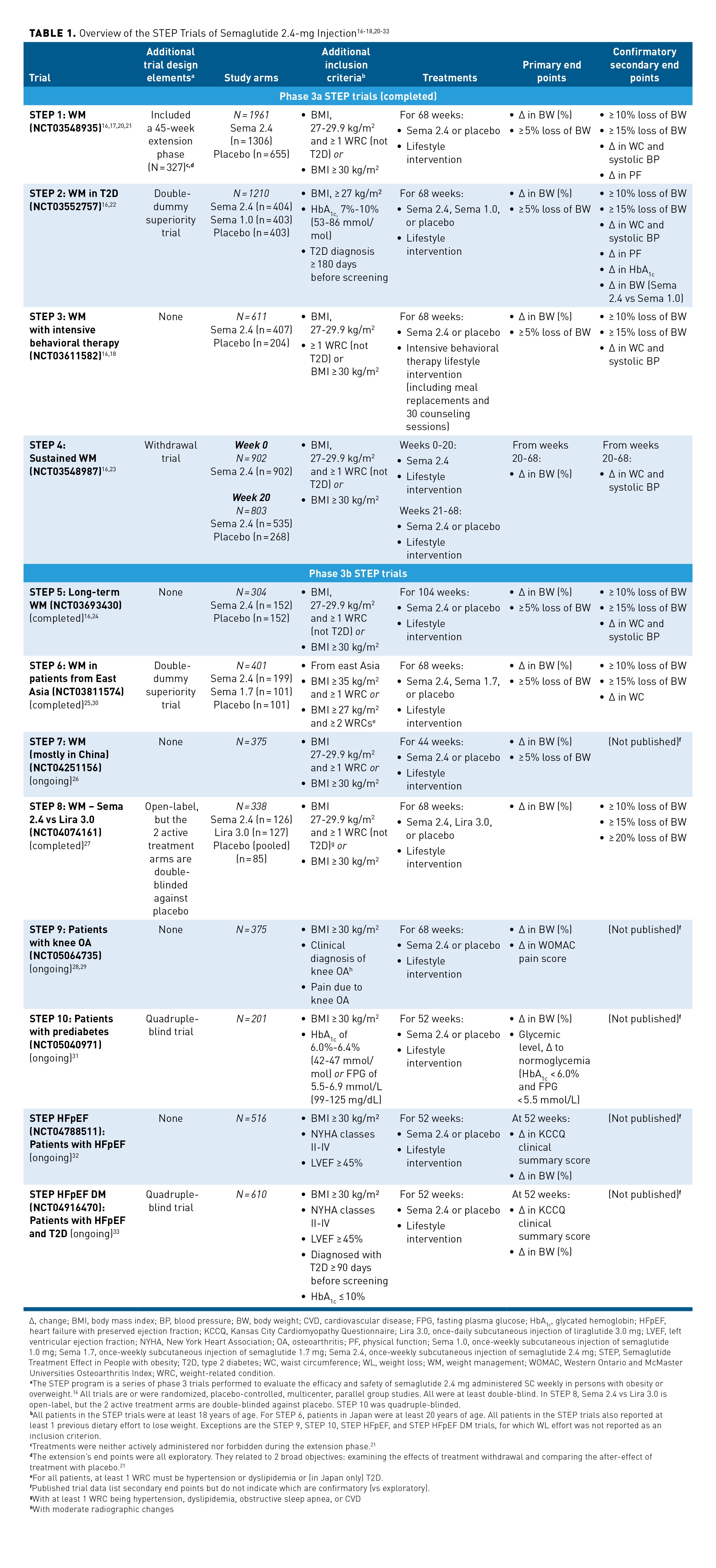 For more information regarding the study design, treatment arms, inclusion/exclusion criteria, primary end points, and confirmatory secondary end points of the STEP 1, 2, 3, and 4 trials, please see Table 1.16-18,20-33