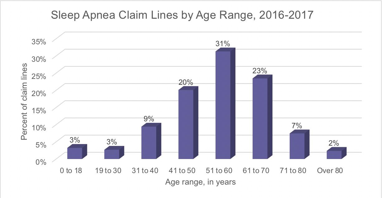 Being middle-aged or older is often considered to be a risk factor for sleep apnea. Again, studying the distribution of sleep apnea claim lines in the period 2016-2017, we found that the peak age range was that of individuals 51 to 60 years old, who accounted for 31% of claim lines. Patients 61 to 70 years old were second, representing 23% of claim lines, and those 41 to 50 years old were third, constituting 20% of claim lines.