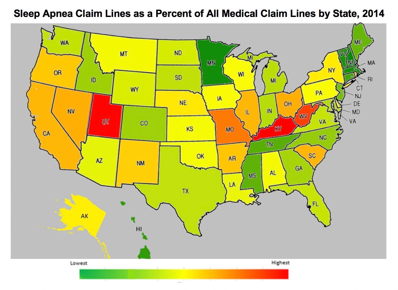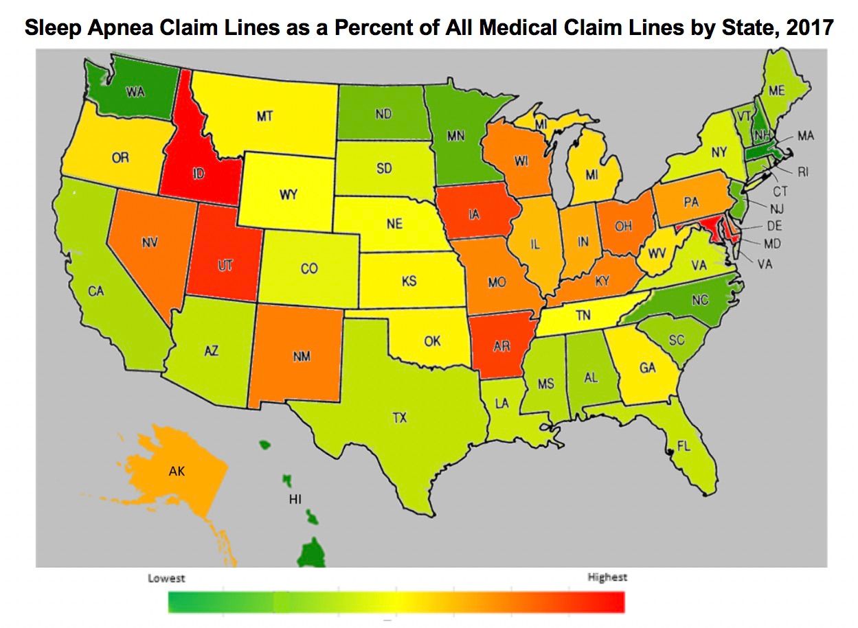 From 2014 to 2017, the states with the greatest and least prevalence of sleep apnea changed. In 2014, the 5 states with the most sleep apnea claim lines as a percent of all medical claim lines were (from most to least) Kentucky, Utah, West Virginia, Missouri and Ohio. In 2017, that list was Maryland, Idaho, Utah, Arkansas and Iowa. Only Utah appeared on both lists.