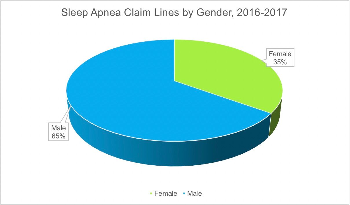 Men are generally considered to be more likely to be diagnosed with sleep apnea than women. Our research confirms this pattern. In the period 2016-2017, males accounted for 65% of sleep apnea claim lines, females 35%.