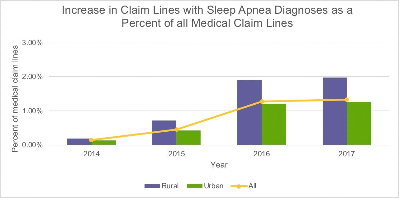 We found that sleep apnea claim lines increased 850% across the nation from 2014 to 2017. The increase was particularly high in rural settings—911%—while in urban settings it was 839%. Rural diagnoses of sleep apnea grew from 0.2% of all rural medical claim lines to 1.98%. In urban settings, the increase was from 0.13% of all urban medical claim lines to 1.27%, and nationally, from 0.14% of all national medical claim lines to 1.33%.