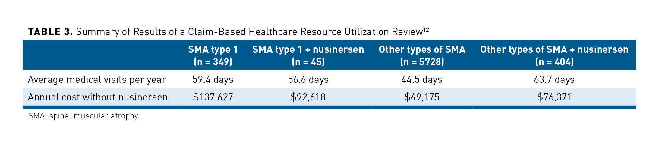 In 1 claim-based healthcare resource utilization review of patients with SMA from September 1, 2016 to August 31, 2018, patients were categorized into 4 cohorts: (1) patients with SMA type 1, (2) patients with SMA type 1 on nusinersen, (3) patients with other types of SMA, and (4) patients with other types of SMA on nusinersen. When the cost of nusinersen was excluded, the annual cost of treating patients with SMA type 1 (no nusinersen) was $137,627 compared with $92,618 in the SMA type 1 on nusinersen group. This may have been associated with a decrease in annual inpatient days of 14.1 and 4.6, respectively. However, this decrease in medical visits per year and annual cost without nusinersen was not consistent with other types of SMA. Authors noted limitations to their results, which included potentially underestimated costs that were not in the claims system. While limited, these data support that for those with SMA type 1, treatment of nusinersen reduced healthcare resource utilization and other total costs. These cost savings were offset by the real-world cost of nusinersen, which was $191,909 PMPM for the first 3 months (loading dose) followed by $36,882 PMPM for maintenance costs. The study results are summarized in Table 3.12
