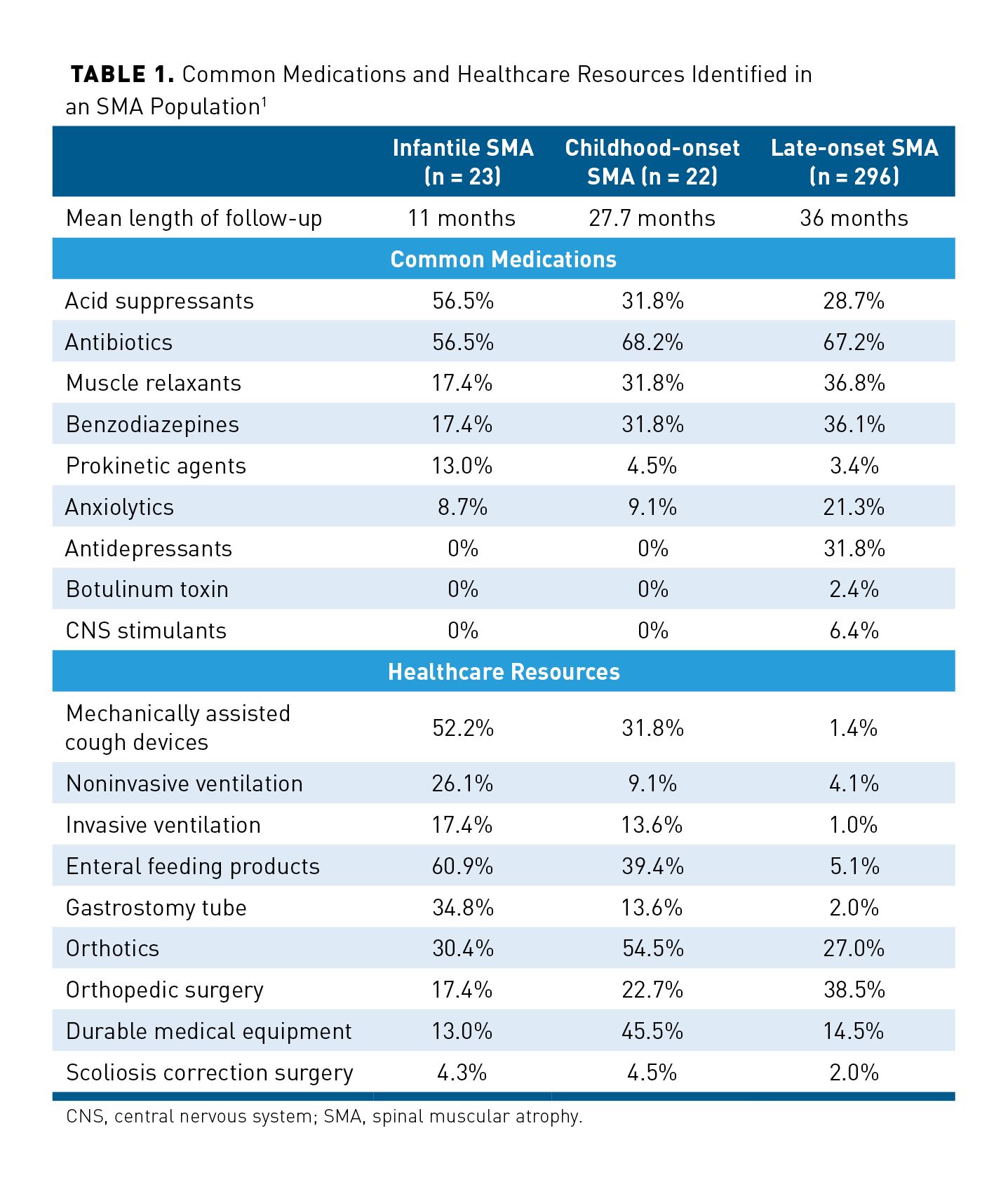 The cost burden of patients with spinal muscular atrophy (SMA) is significant and varies due to the type of SMA and medications used. In a study conducted from January 2006 to March 2016 (before approval of pharmacologic therapy), investigators evaluated healthcare resource utilization and costs in patients. A total of 341 patients with SMA included in the analysis were stratified by infantile-onset SMA before age of 6 months (mean age, 0.2 years; n = 22), childhood-onset SMA between 6 months and 3 years of age (mean age, 0.9 years; n = 22), and late-onset SMA, which included all other patients with SMA (mean age, 52.2 years; n = 296), then were compared with a cohort without SMA. Medications that these patients used during their follow-up period were consistent with physical symptoms of SMA, such as gastroesophageal reflux disease, respiratory tract infections, muscle spasm, difficulty moving muscles and joints, and concurrent mental health disorders. Medications that have been used most commonly were acid suppressants, antibiotics, muscle relaxants, benzodiazepines, prokinetic agents, and anxiolytics. Of note, those with infantile SMA have observed higher rates of acid suppressants and prokinetic agents, whereas those of older-onset SMA had more use of muscle relaxants, benzodiazepines, anxiolytics, and antidepressants. Although these medications are generically available and inexpensive, there is an increased burden of higher medication usage. These medications are summarized in Table 1.1