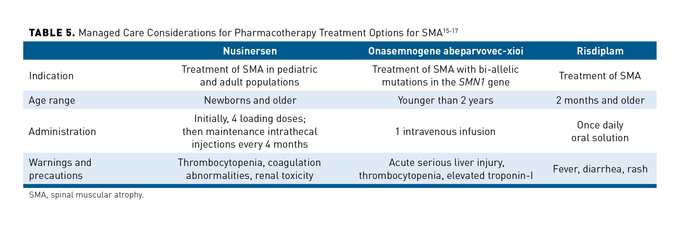 When developing coverage criteria for medications used for SMA, managed care pharmacists should also take into consideration drug-specific characteristics, such as indication, approved age range, administration concerns, and significant safety concerns. Table 5 summarizes these considerations.15-17 Considerations for nusinersen include evaluation for spinal deformities, planning for regular intrathecal administration, and coordination with the patient to ensure access to a location for appropriate administration. Costs of these administrations should consider things like transportation and lodging, especially in geographically isolated patients. While risdiplam has fewer administration concerns (oral solution), it lacks long-term safety and efficacy data and is only indicated for patients 2 months and older. Onasemnogene abeparvovec-xioi is administered once and is only indicated for patients who are younger than 2 years and meet eligibility requirements. Patients with late-onset SMA would not fit into this demographic.