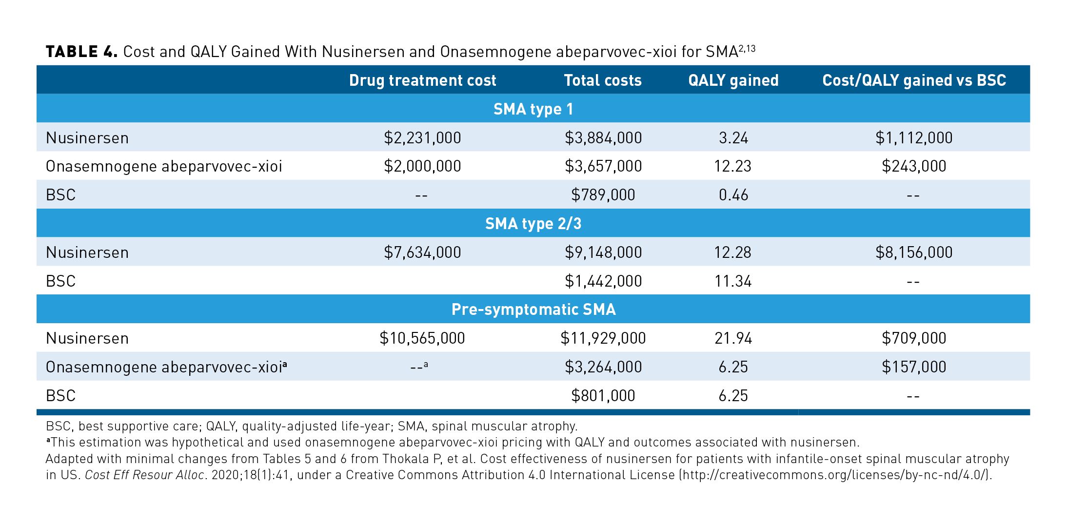 In an ICER review of nusinersen and onasemnogene abeparvovec-xioi for SMA, costs per quality-adjusted life-year (QALY) gained were described by type of SMA and intervention. For SMA type 1, the total cost of treatment with nusinersen and nontreatment healthcare costs were $3,884,000 compared with $789,000 for BSC. Nusinersen use was associated with total QALY gained of 3.24 years, total life-year (LY) gained of 7.64 years, and cost/QALY of $1,112,000. This is in comparison with onasemnogene abeparvovec-xioi, which had a relatively similar total cost of care of $3,657,000, a total of 12.23 QALY gained, 18.17 LY gained, and a cost/QALY gained of $243,000. It should be noted that this was before the approval of risdiplam, the other medication approved for the treatment of SMA. These results are summarized in Table 4.2,13