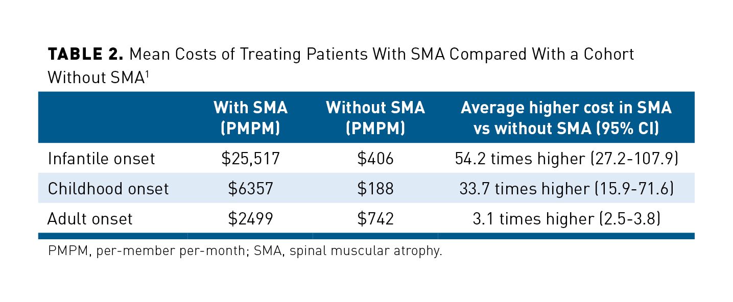 The high rates of medication usage and healthcare resource utilization translate into high costs associated with SMA. On a per-member per-month (PMPM) basis, those in the infantile SMA group had the highest mean costs ($25,517) followed by childhood onset ($6357) and late onset ($2499). In the matched cohort without SMA, the cost was significantly lower in the infantile group ($406), childhood onset ($188), and late onset ($742). A comparison of these costs is outlined in Table 2.1 It is also important to note that the average cost to treat a patient with infantile-onset SMA was 54.2 times higher than someone without SMA during a similar follow-up period; childhood onset was 33.7 times higher; and adult onset was 3.1 times higher.1