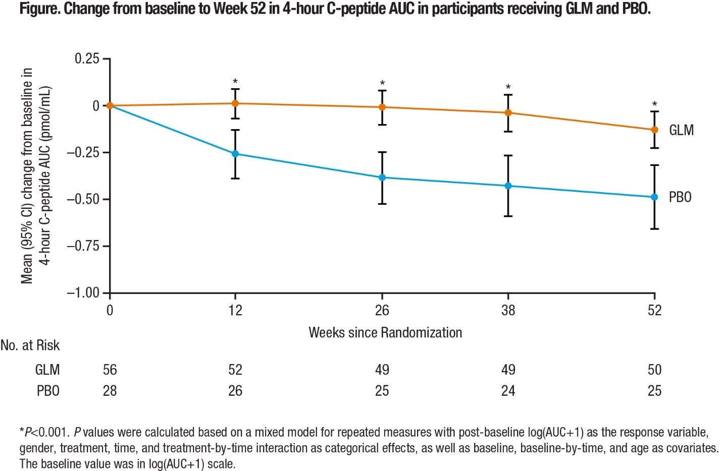 In this phase 2a, double-blind placebo-controlled study, 84 randomized participants aged 6 to 21 years were assigned to receive golimumab (56 patients) or placebo (28 patients). Both the study drug and the placebo were given subcutaneously.2 The primary end point was C-peptide area under the curve (AUC) at week 52 after a 4-hour mixed-meal tolerance test. Insulin use, A1C, hypoglycemia rates, and proinsulin/C-peptide ratios were measured.
