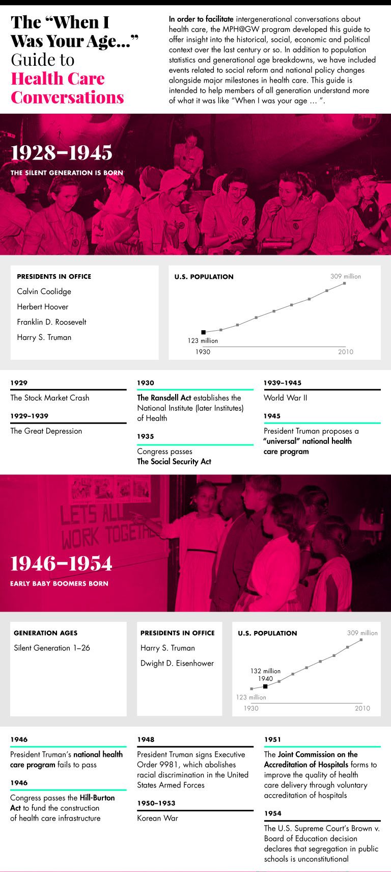 As baby boomers age, more millennials will enter the health care workforce. Health outcomes of the baby boomer generation will depend heavily on the quality of communication with a generation that has grown up in a very different time. The United States has changed drastically since baby boomers were children. To help facilitate more effective and meaningful intergenerational discussions about health care, MPH@GW, the online Master of Public Health program offered by The Milken Institute School of Public Health at The George Washington University, developed The “When I Was Your Age…” Guide to Health Care Conversations.