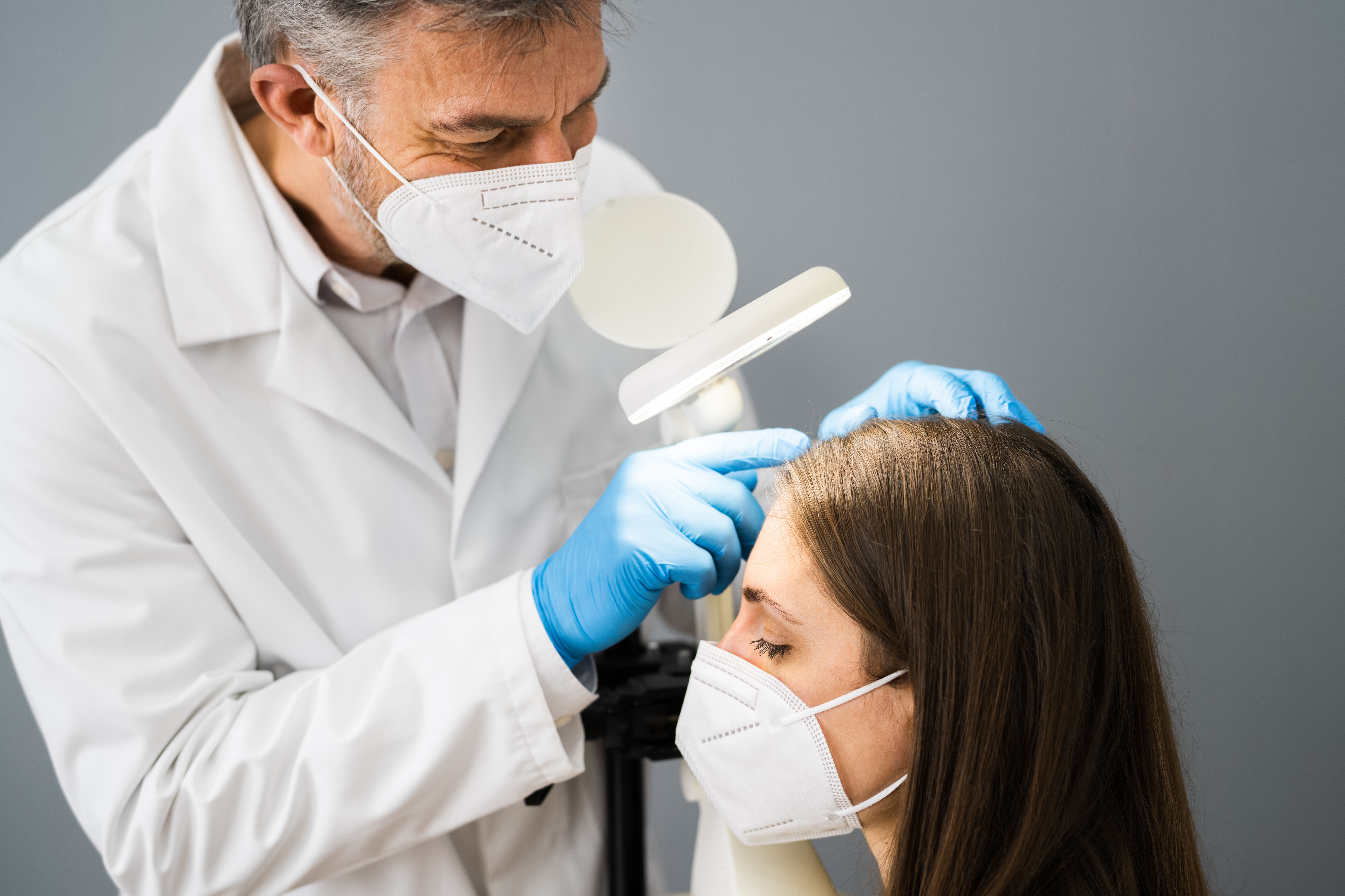 Dermatologist checks patient's scalp, wearing surgical masks | Image Credit: Andrey Popov - stock.adobe.com