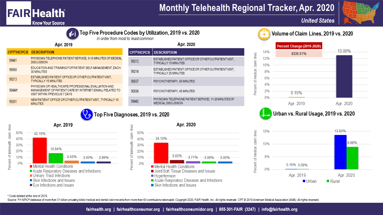 Launched in May as a free service, the Monthly Telehealth Regional Tracker uses FAIR Health data to track how telehealth is evolving on a monthly basis. An interactive map of the 4 US census regions allows the user to view an infographic on telehealth in a specific month in each region, or in the nation as a whole. In addition to data on the volume of claim lines, urban versus rural usage, and diagnoses, each infographic includes findings on the top five telehealth procedure codes.