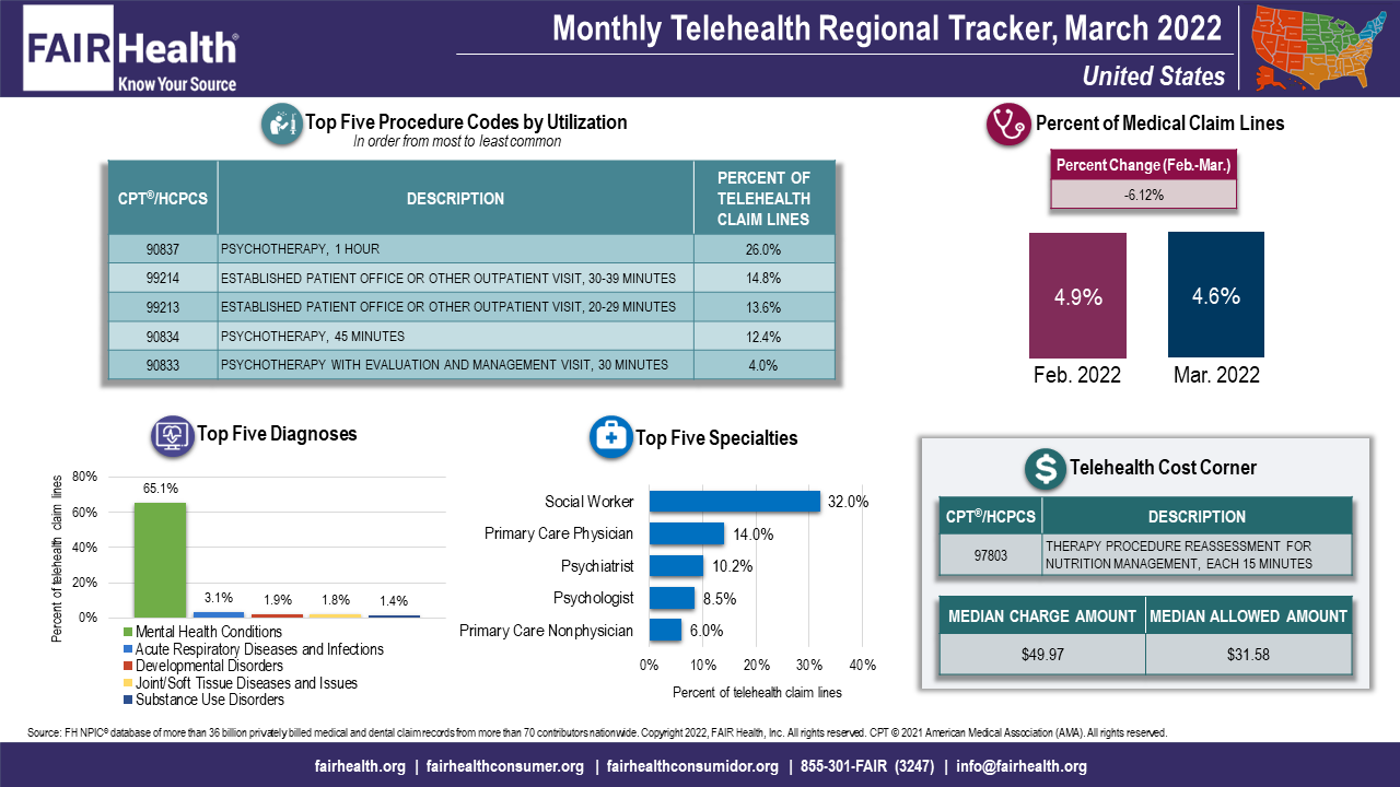 In March 2022, the rankings of the top 5 telehealth procedure codes did not change nationally or in any region. The number one telehealth procedure code nationally and in every region remained CPT®[1] 90837, one-hour psychotherapy.