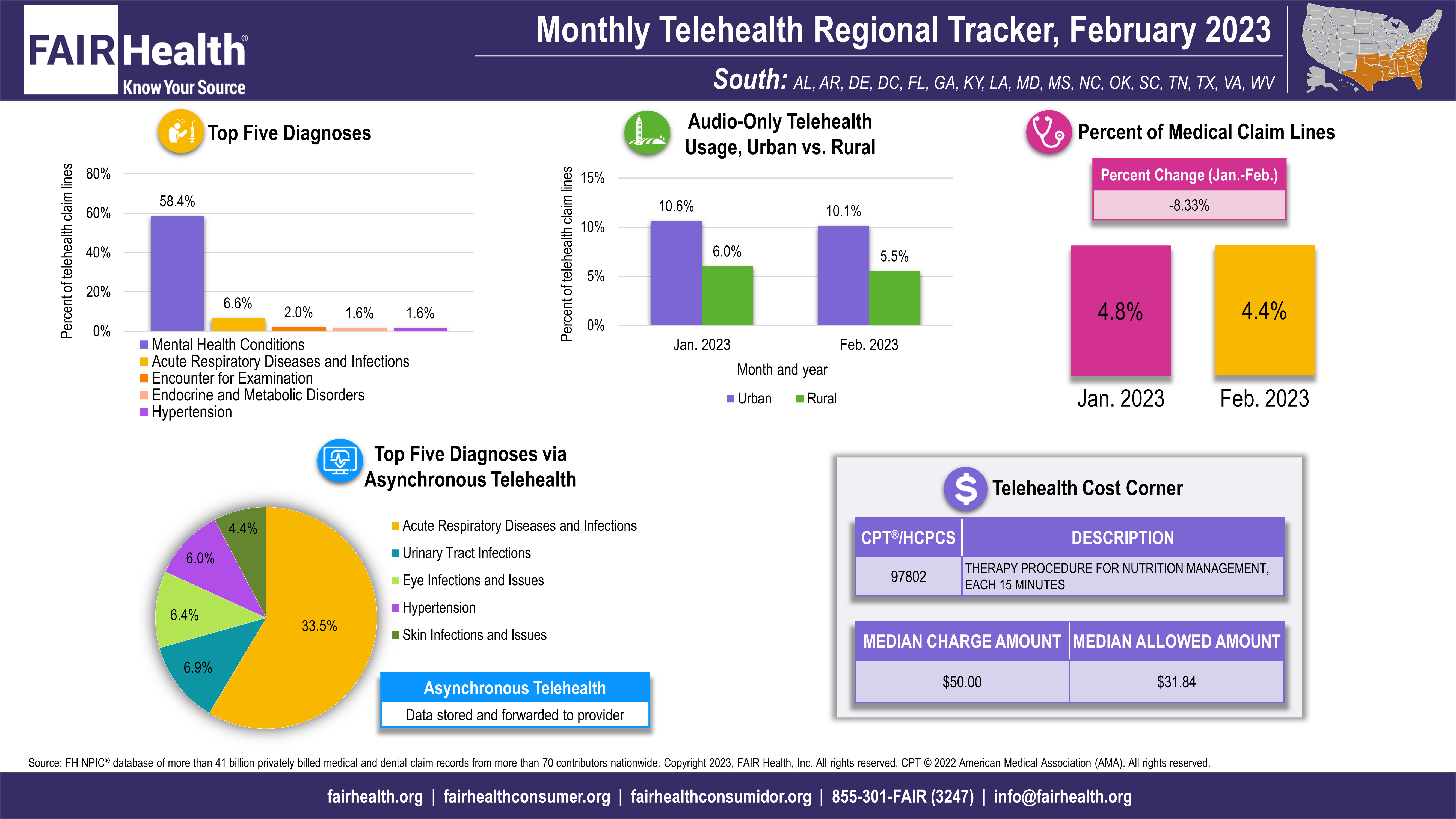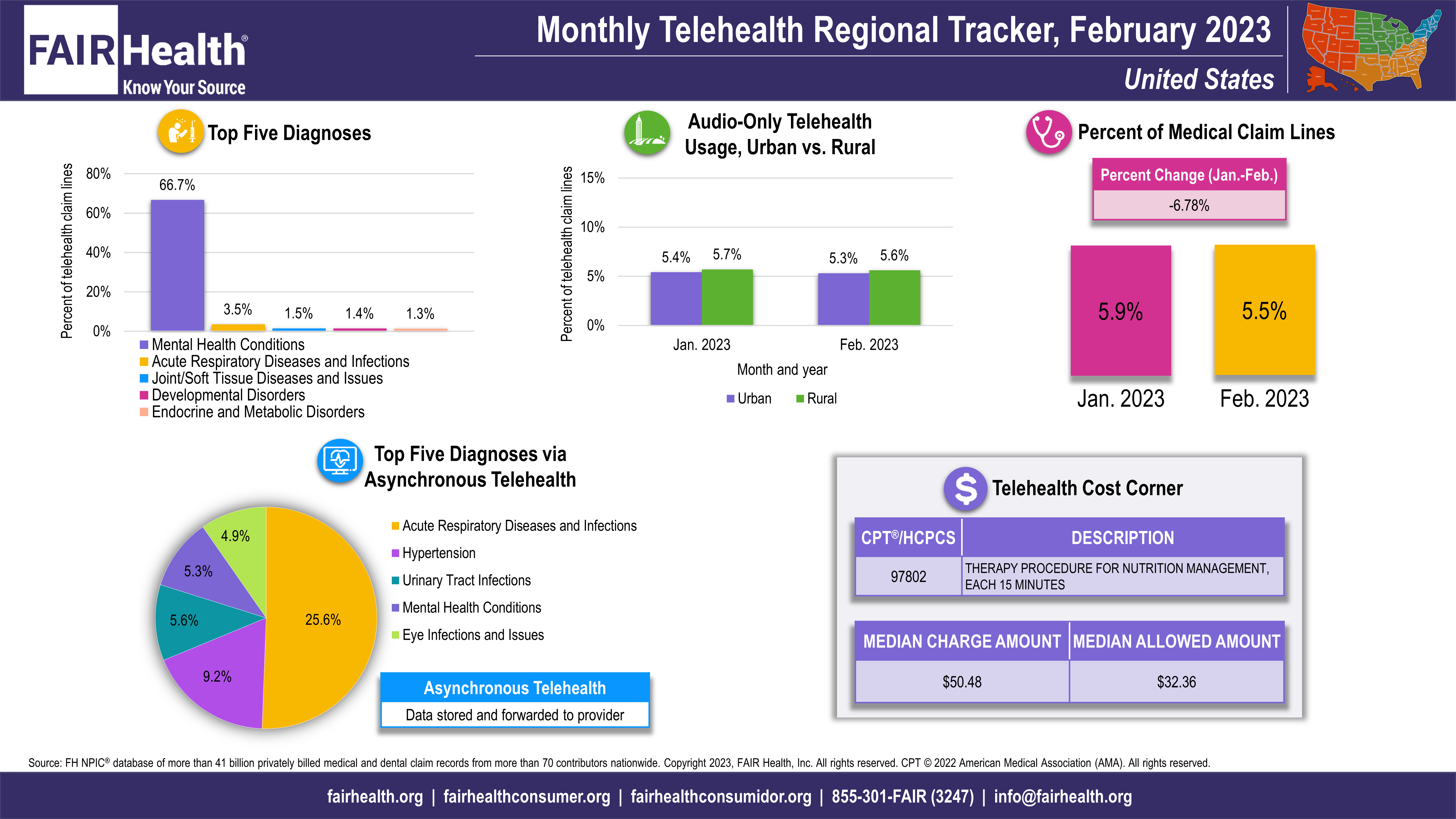 National telehealth utilization declined 6.8% in February 2023, from 5.9% of medical claim lines in January to 5.5 % in February, according to FAIR Health’s Monthly Telehealth Regional Tracker (FIGURE 1). The decline followed 3 months of growth from November 2022 to January 2023. In February, telehealth utilization also decreased in all four US census regions—the Midwest (8.7%), the South (8.3%), the West (6.2%) and the Northeast (1.5%). The data represent the privately insured population, including Medicare Advantage and excluding Medicare Fee-for-Service and Medicaid.