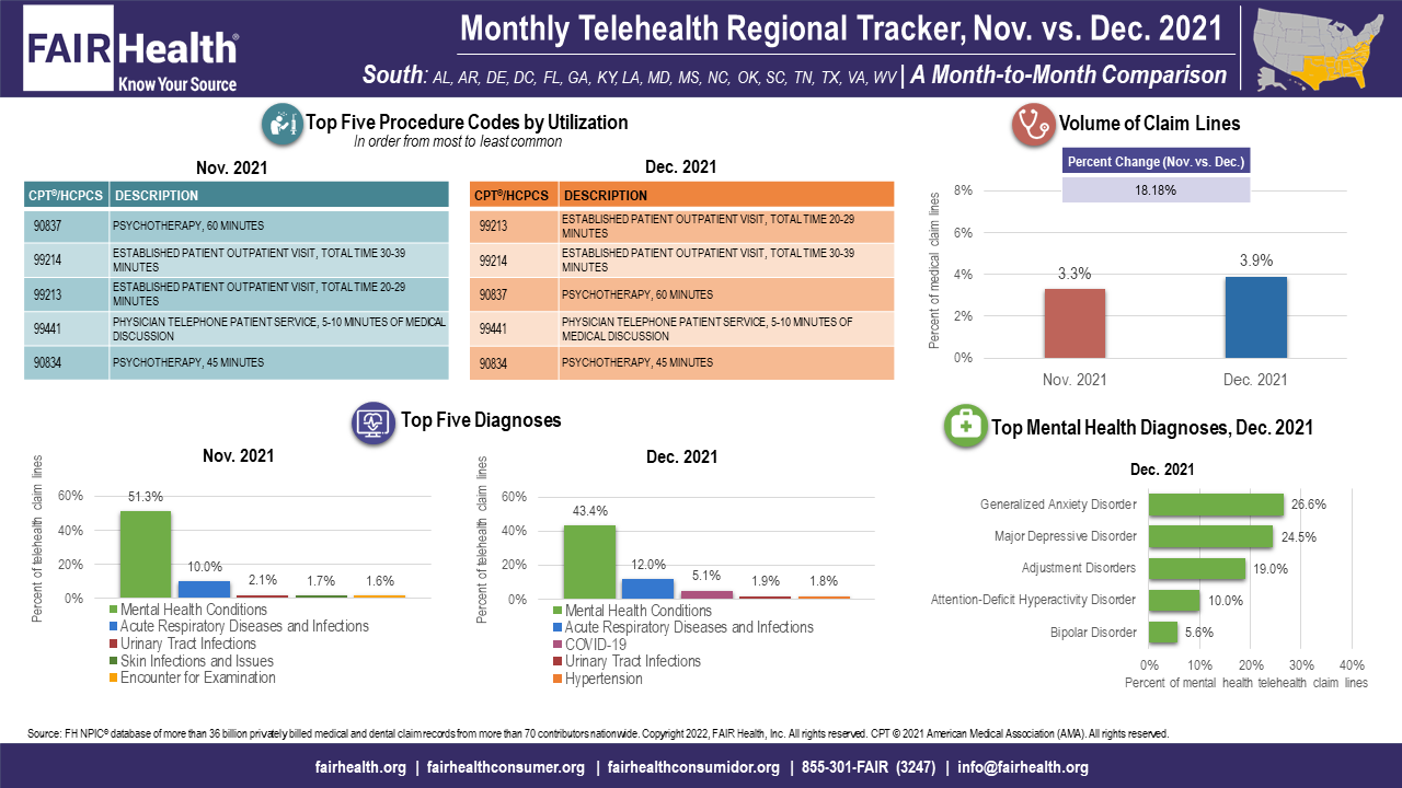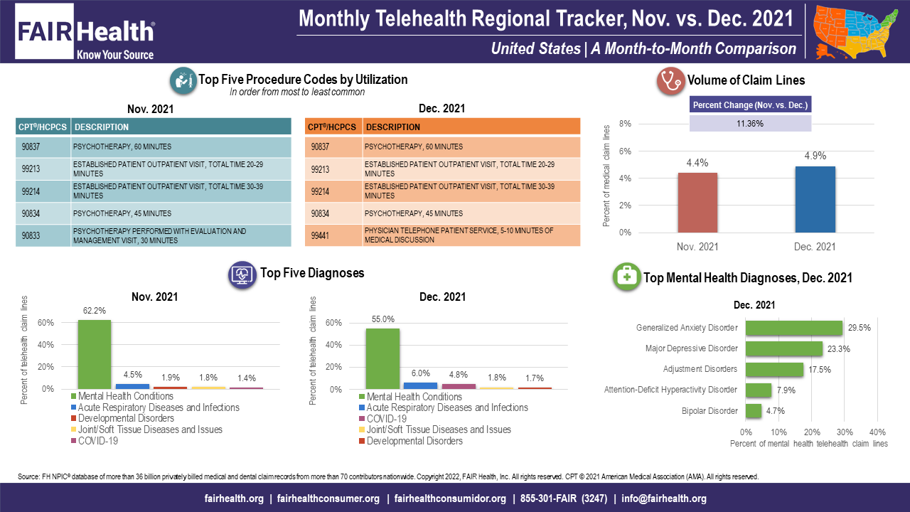 Launched in May 2020 as a free service, the Monthly Telehealth Regional Tracker uses FAIR Health data to track how telehealth is evolving from month to month. An interactive map of the four US census regions allows the user to view an infographic on telehealth in a specific month in the nation as a whole or in individual regions. Each infographic shows month-to-month changes in volume of telehealth claim lines, top 5 telehealth procedure codes and top five telehealth diagnoses (or diagnostic categories), along with that month’s top five granular diagnoses within the most common diagnostic category.