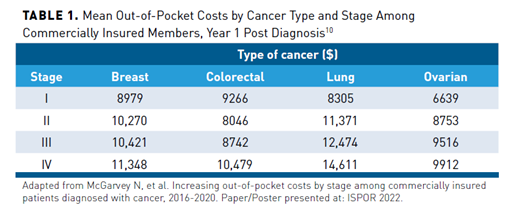Patients with cancer shoulder a significant part of the economic burden, with an estimated $16 billion in out-of-pocket expenses to diagnose and treat their cancer in 2020.9 The more advanced the presentation of cancer, the higher those costs. A study presented at the 2022 International Society for Pharmacoeconomics and Outcomes Research (ISPOR) Annual Meeting assessed out-of-pocket costs (co-insurance, co-pay, and deductible) for the first year after diagnosis for 6028 commercially insured patients with cancer, the majority of whom had breast cancer. Those diagnosed with stage I breast cancer had mean costs of $8979 while those diagnosed with stage IV encountered mean out-of-pocket costs of $11,348 (P <.001) The results were similar for ovarian, lung, and colorectal cancers (Table 110). The authors suggested that earlier diagnosis could reduce patient financial burden by requiring less intensive treatment and management.10