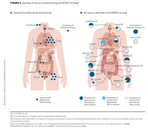 Detecting cancers as early as possible, when treatment is more likely to be successful, is an important way to reduce overall cancer mortality.5 Earlier diagnoses can also result in significant economic savings.One study found an absolute mean cost for women diagnosed with stage I ovarian cancer of $73,428; by stage IV, the cost increased to $227,899, a more than 4-fold difference. Costs for colorectal cancer doubled, from $129,645 when diagnosed in stage I to $271,216 when diagnosed in stage IV.6 Thus, earlier diagnosis could have economic as well as lifesaving benefits, provided it is not associated with a high burden of overdiagnosis and overtreatment.7,8