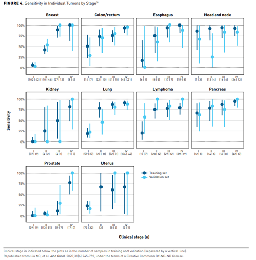 Galleri examines cfDNA methylation patterns across a very large number of methylation sites and uses AI analysis to recognize patterns associated with the presence of cancer as well as the likely organ of origin of the suspected malignancy. It has been shown to detect more than 50 cancers.38 Figure 438 depicts its sensitivity in individual tumors by stage.