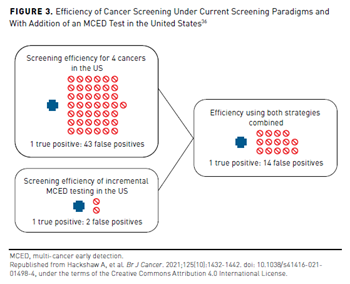 One study estimating the impact of adding MCED screening to standard population-based screenings for breast, cervical, colorectal, and lung cancers predicted it would result in a diagnosis of an additional 105,526 cancers with a 25% uptake and an additional 189,498 cancers with a 100% uptake. The estimated true-positive/false-positive (TP/FP) rate with current screening was 1.43 (43 false positives for every person diagnosed with cancer) at a cost of $89,042 to confirm there was no cancer versus 1:1.8 using the MCED test at a cost of $7060 (Figure 336).