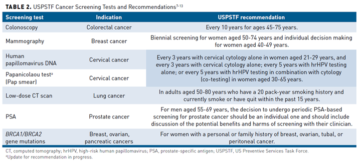 The US Preventive Services Task Force (USPSTF), an independent, volunteer panel of national experts in disease prevention and evidence-based medicine that makes evidence-based recommendations about clinical preventive services, currently recommends population-based screening for breast, colorectal, and cervical cancers, with prostate cancer screening based on a discussion of the potential harms and benefits.12-15 It also recommends screening certain smokers for lung cancer.12Table 27-13 contains a summary of cancer screening tests and recommendations from the USPSTF.