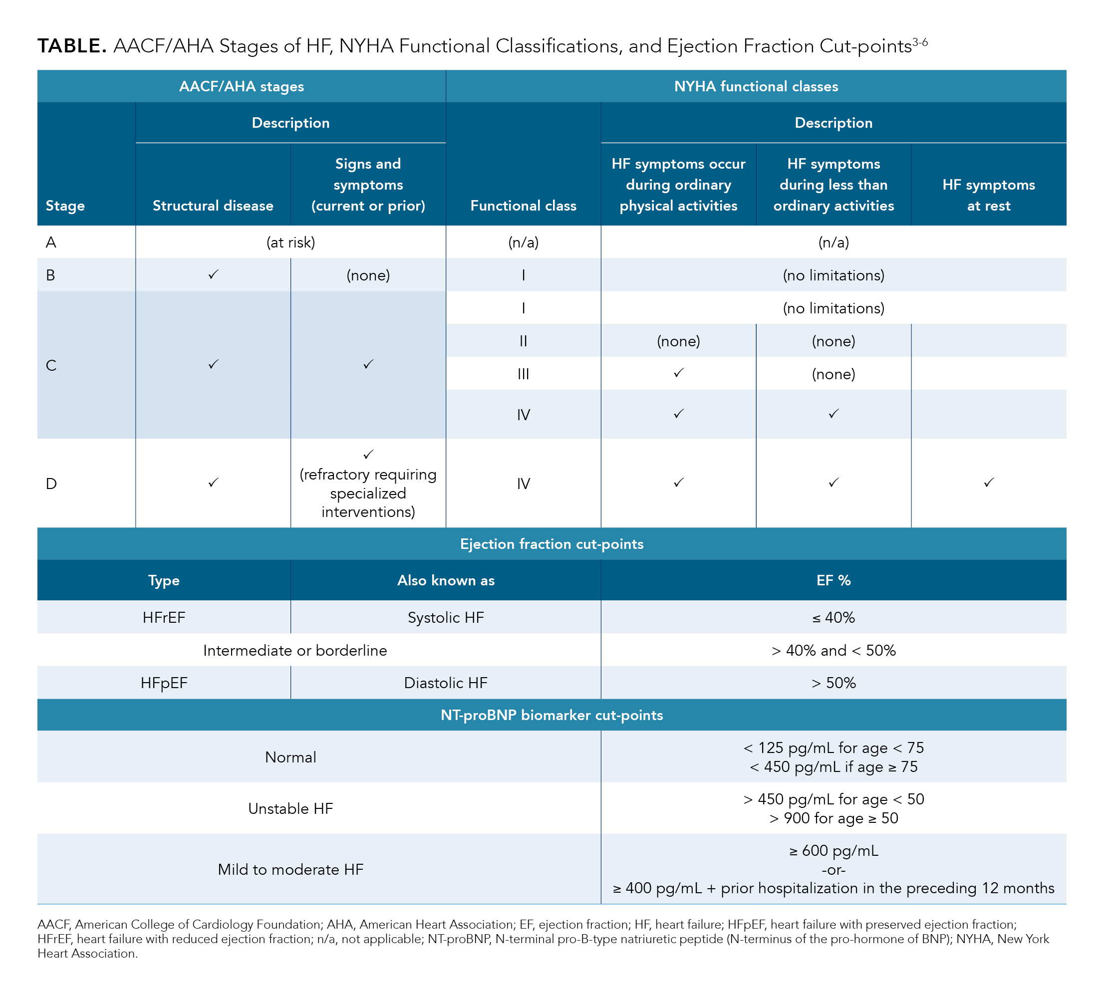 The American College of Cardiology Foundation/American Heart Association (ACCF/AHA) stages of HF and the New York Heart Association (NYHA) functional classes provide different yet complementary information regarding disease status in HF (Table3-6). AHA structural stages are progressive; that is, once a patient moves to a higher stage, they cannot regress to a lower stage.3 The NYHA functional classes, on the other hand, focus on the symptomology a patient is experiencing at a given time point; thus, assignment of NYHA is more fluid and subject to change throughout the historical time course of disease.3 Phenotypical characterizations of HF (reduced ejection fraction and preserved ejection fraction) are also summarized in the Table.