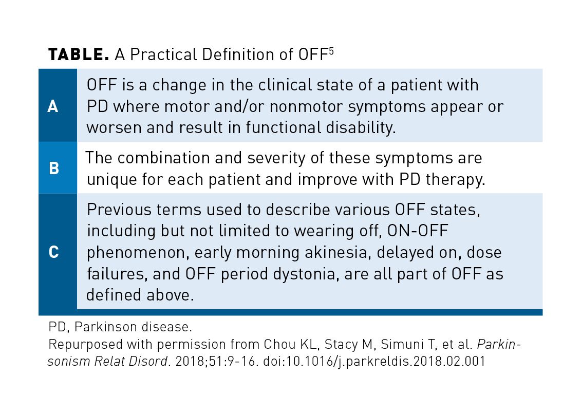 Parkinson disease (PD) is the second-most-common neurodegenerative disease in the world,1 expected to affect at least 1.2 million people in the United States by 2030.2 An incurable, chronic disease, its economic impact can be substantial for people with Parkinson disease (PwP) and their caregivers. All PwP experience a characteristic motor syndrome of bradykinesia, resting tremor, muscle rigidity with associated gait disorder, and postural instability.1 Most patients also experience 1 or more nonmotor symptoms, including autonomic dysfunction, sleep disorders, mood disorders, bowel and/or bladder dysfunction, and cognitive abnormalities.3,4 The motor symptoms of PD can be decreased or ameliorated by symptomatic therapies, but as the disease progresses, response to therapy declines, and patients experience periods with reduced or absent symptomatic benefit, despite optimized therapeutic dosing; these are termed OFF episodes.5 No formal definition of OFF exists; however, Chou and colleagues proposed a multifactorial, practical definition of OFF, which includes a change in patients during which nonmotor and motor symptoms appear or worsen (Table).5