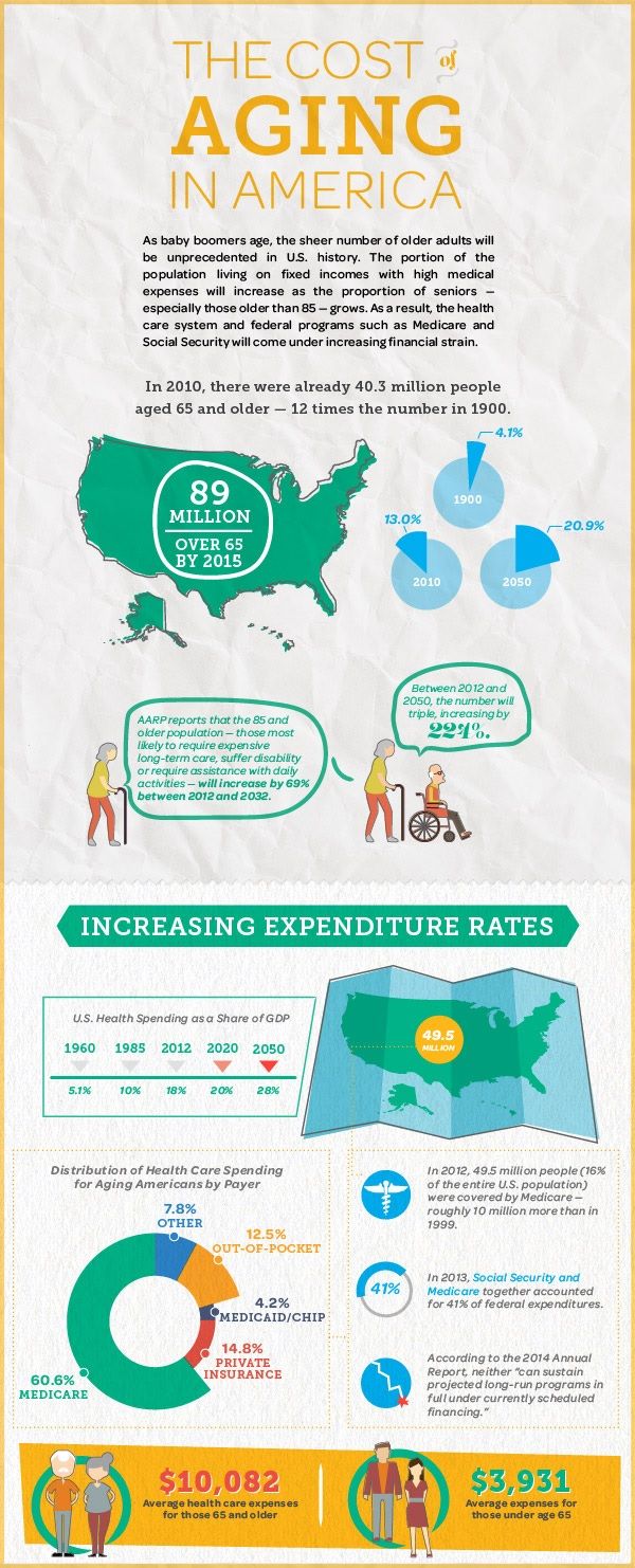 As noted, the cost of aging places a significant burden on society as a whole. US health spending as a share of gross domestic product (GDP) was 5.1% in 1960 and is predicted to rise to 20% by 2020 and 28% by 2050. Safety net programs, like Medicare and Social Security, help provide direct payments to the healthcare system and the financial support that many older Americans count on. In 2013, the 2 programs accounted for 41% of federal expenditures—a trend that has been cited by experts as being unsustainable in the long term within the current framework.