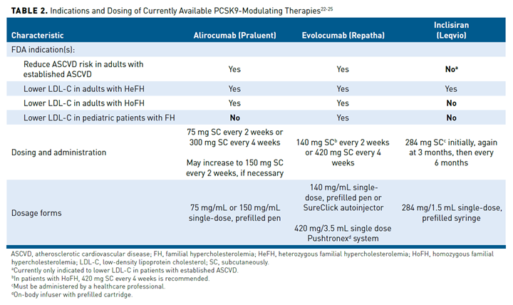 Given the large body of safety and efficacy data, alirocumab and evolocumab are both indicated for use in patients with established ASCVD or FH who require additional LDL-C lowering despite maximally tolerated statin therapy.23,24 Only evolocumab, however, is approved for use in pediatric patients aged 10 years and older. Despite the favorable data and approved indications, the uptake of PCSK9 mAbs remains poor. A retrospective study using a national commercial claims database (2015-2019) found that less than 1% of patients with established ASCVD and an LDL-C greater than or equal to 70 mg/dL who were adherent to a high-intensity statin received a PCSK9 mAb.48 Similar findings were also observed in an analysis of real-world electronic health record data from the National Patient-Centered Clinical Research Network in more than 3.6 million patients.49 The use of PCSK9 mAbs in Medicare Part D beneficiaries is also low but increased steadily between 2015 and 2018.50 The average spending per beneficiary on alirocumab and evolocumab was $8746 and $7267, respectively; while this is significant, it was prior to the approximate 60% price reduction in 2019.50
