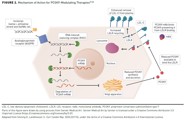 More recently, inclisiran, a small interfering RNA (siRNA) molecule against PCSK9, was approved by the FDA in 2021. Unlike the PCSK9 mAbs, inclisiran inhibits the production of intracellular PCSK9 through gene silencing (Figure 2).27,28 Inclisiran contains 2 nucleotide strands conjugated to a ligand that binds to a receptor found nearly exclusively on hepatocytes. Inclisiran is taken up by the hepatocyte via the asialoglycoprotein receptor and binds to the RNA-induced silencing complex, which cleaves the PCSK9 messenger RNA and prevents PCSK9 protein synthesis. The absence of PCSK9 enzymes prevents degradation of the LDLR, which is recycled to the hepatocyte service to reduce the circulation of LDL-C in the plasma. A major advantage of this approach is the long duration of the effect, which allows drug administration every 6 months instead of the biweekly or monthly administration of the PCSK9 mAbs (Table 2).22-25