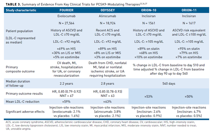 Statin therapy remains the first-line treatment option for hypercholesterolemia, and most patients will tolerate the statin intensity indicated. However, it is commonly acknowledged that anywhere from 5% to 30% of patients will develop either partial or complete statin intolerance and require nonstatin therapies to achieve desired levels of LDL-C.5 Step therapy remains a reasonable approach. Adding generic ezetimibe to maximally tolerated statin therapy will achieve treatment goals in most patients and is considered a cost-effective strategy. Ezetimibe should generally be considered before adding bempedoic acid or PCSK9-modulating therapies. The PCSK9 mAbs should be reserved for patients with established ASCVD or FH who are unable to achieve treatment goals with maximally tolerated statin plus ezetimibe. Until evidence is available demonstrating that inclisiran and bempedoic acid reduce ASCVD events, these therapies should generally be reserved for patients unable to tolerate a PCSK9 mAb or in rare cases of inadequate LDL-C lowering. Another consideration for use may be those who are unable to perform self-injections or who would not be able to adhere to a biweekly or monthly regimen. Nonadherence to any PCSK9-modulating therapy must be avoided at all costs given the expense of these therapies. The VICTORION REAL study is currently underway to determine if every-6-month dosing with inclisiran improves adherence compared with standard of care.67