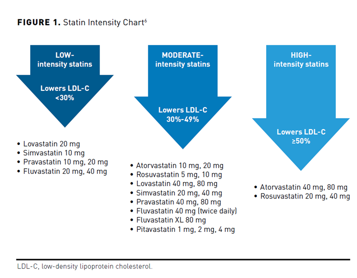 Clinical practice guidelines are important tools to inform evidence-based practice and help address gaps in care. The most recent American Heart Association (AHA)/American College of Cardiology (ACC)/Multisociety Guideline on the Management of Blood Cholesterol was published in 2018.6 Statin therapy remains the first-line therapy to lower LDL-C and ASCVD risk. The decision to initiate statin therapy is largely driven by individual risk of ASCVD; the intensity of statin therapy increases with risk (Figure 1).6 For example, patients with established ASCVD should receive a high-intensity statin, while a moderate-intensity statin is recommended for primary prevention patients with an estimated 10-year ASCVD risk score of 7.5% to 19.9% and risk-enhancing factors. Low-intensity statins are generally not advised except in cases where moderate- or high-intensity statins are not tolerated.